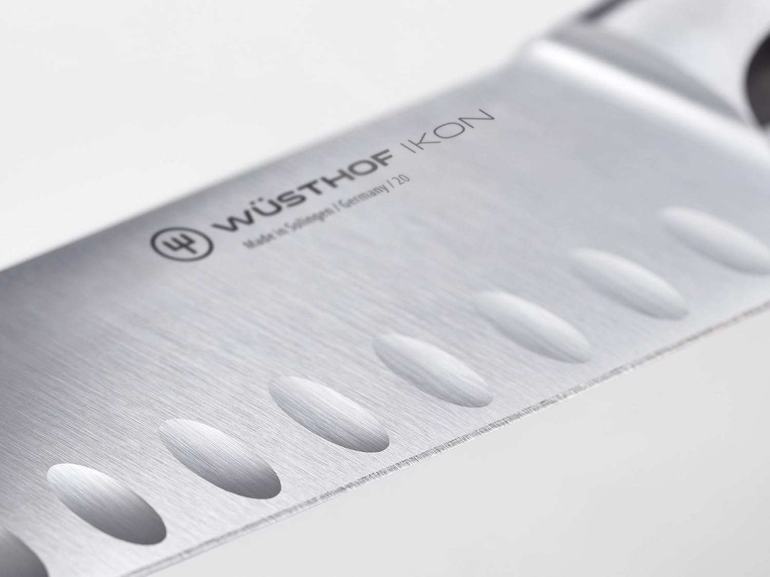 Die extrem scharfe Klinge, die optimale Balance durch die spezielle Doppelkropf-Geometrie und der erlesene, individuell gemaserte Holzgriff machen die Messer der Ikon Serie zu einem eleganten Eyecatcher – auch in der Messerauswahl von Profi-Köchen Ikon Messerset mit stilvoller Profi-Messer Grundausstattung: Gemüsemesser mit 9 cm Klinge, Aufschnittmesser 14 cm mit Sägeschliff, Schinkenmesser 16 cm, Brotmesser 23 cm mit Wellenschliff, Santoku mit Kullen 17 cm, Kochmesser 20 cm Der schmuckvolle Design-Messerblock aus braunem Eschenholz ergänzt ideal die feinen Griffe der Ikon Messer. Er präsentiert die Messer immer griffbereit und schützt die Klingen zuverlässig vor Beschädigungen. Maße: B 33,4 cm, H 33,8 cm, T 11,5 cm Die edlen, braunen Griffe aus afrikanischem Grenadill liegen optimal in der Hand – sie sind optisch wie haptisch eine echte Besonderheit. Das wasserabweisende Massivholz ist ausgesprochen hygienisch und stammt aus kontrolliertem Anbau Die rostfreien Klingen mit 58° Rockwell Härte werden im laserbasierten Schärfverfahren geschliffen und erhalten danach in Handarbeit ihre ultimative Schärfe. Die Messer sind außerordentlich belastbar. Wüsthof – Made in Germany, geschmiedet in Solingen | قیمت یورویی : 1049€