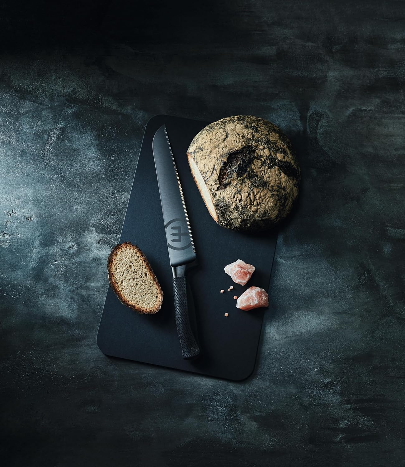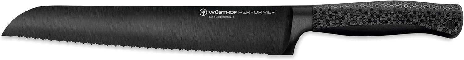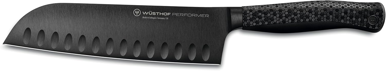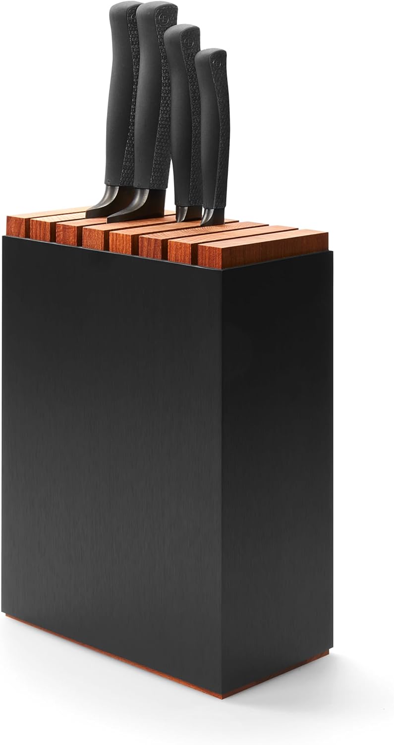 Messerblock mit Messern aus edler Thermobuche, umhüllt von schwarzem Aluminium. Flexibel anpassbar mit Platz für bis zu sieben Performer Messer. Sei bereit für rasantes, tiefschwarzes Design. Fühle die Power echter Profi-Kochmesser Messer-Block- Set mit 4 richtig guten Messern: großes Kochmesser (20 cm), 1 japanisches Messer (Santoku mit Kullen, 17 cm), 1 Brotmesser mit Präzisions-Doppelwelle (23 cm) und 1 Gemüsemesser (9 cm) für filigrane Detailarbeiten – ein unschlagbares Team DLC-Technologie: die schwarze Beschichtung stammt aus Raumfahrt und Motorsport und erhöht die Oberflächenhärte des rostfreien Edelstahls um 146 %. Zusätzlich reduziert die DLC-Klinge den Reibungswiderstand – für müheloses Schneiden mit weniger Kraftaufwand Griff mit Hexagon-Power-Grip Design: Der rutschfeste Messergriff und das perfekt ausbalancierte Set-up mit Vollkropf (geschmiedete Verdickung zwischen Klingen und Griff) garantieren extreme Kontrolle bei jedem Schnitt mit diesem Spezialmesser Solinger Messer: Die WÜSTHOF Performer Serie vereint höchste Qualität, dynamische Balance und rasantes Design. Made in Germany – für alle, die keine Kompromisse machen, sondern hochwertige Kochmesser Profi Messer schätzen | قیمت یورویی : 999€
