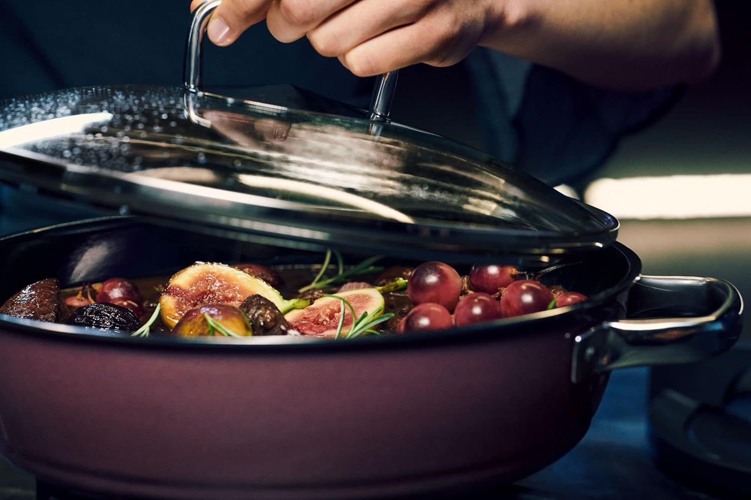 Fusiontec vereint die Wärmeleitfähigkeit von Kupfer, die Wärmespeicherfähigkeit von Gusseisen, die Kratzfestigkeit von Glas, die Korrosionsbeständigkeit von Edelstahl und die Gleichmäßigkeit der Koch- und Bratergebnisse von Aluminium in einem einzigartigen Material. Die tiefe Form lädt förmlich zur Zubereitung der leckersten Schmorgerichte mit intensiven Saucen ein, die dank der beiden seitlichen Griffe elegant und mühelos direkt serviert werden können. Höchste Funktionalität vereint mit atemberaubenden Oberflächen - für einen außergewöhnlich stilvollen Aufritt, der in jeder Küche begeistert. Entwickelt und gefertigt mit der Erfahrung, dem handwerklichen Können und der Leidenschaft unseres Teams in Riedlingen, vereint Fusiontec die besten Eigenschaften bestehender Kochgeschirrmaterialien auf sich. | قیمت یورویی : 129.99€