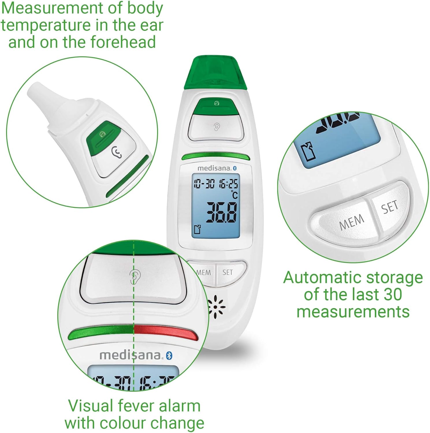 medisana TM 750 connect digitales 6in1 Fieberthermometer Ohrthermometer für Baby, Kinder und Erwachsene, Stirnthermometer mit visuellem Fieberalarm, Speicherfunktion und Bluetooth weiß mit bluetooth | قیمت یورویی 24.99€
