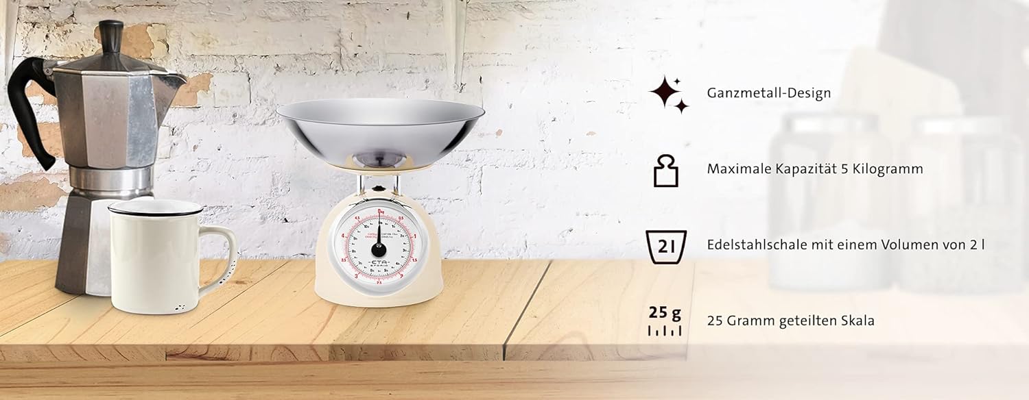 ETA Küchenwaage I Storio I Analoge Retro Waage im Ganzmetall Design I 2 Liter Edelstahlschale I max. 5kg I Beige | قیمت یورویی 31.44€