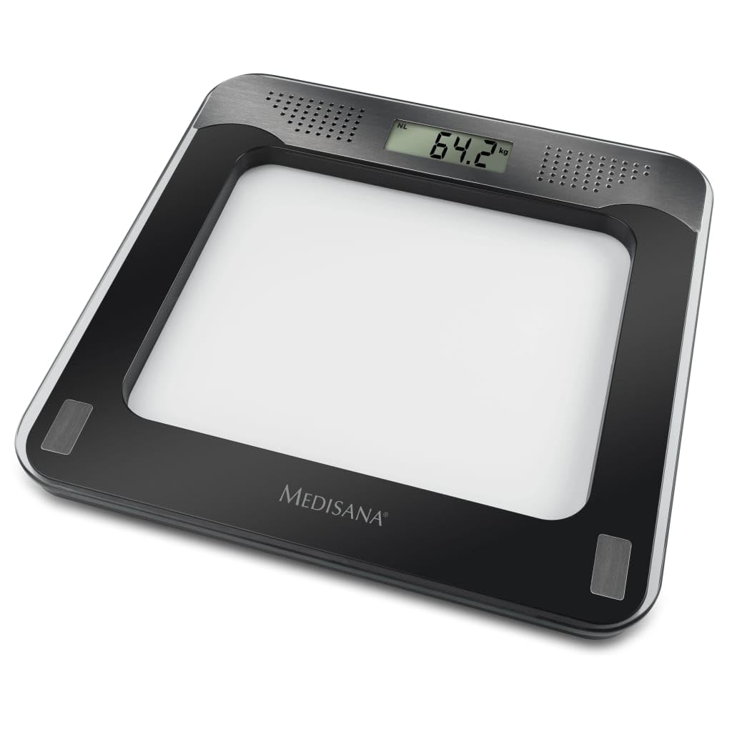 ترازوی حمام سخنگو مدیسانا PS 416، ترازوی دیجیتال دقیق شیشه‌ای، 4 زبان، خاموش شدن خودکار داخلی، تا 180 کیلوگرم، مشکی/نقره‌ای