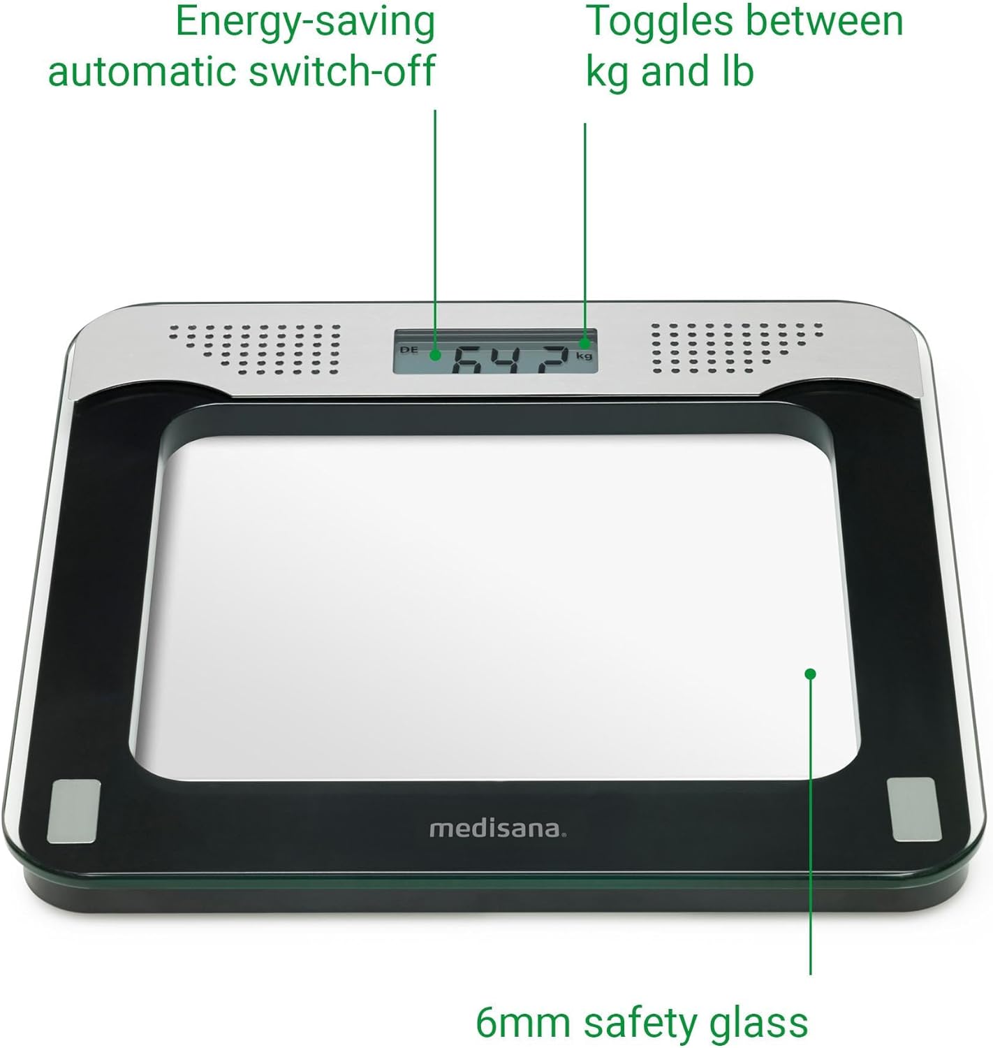 Sprachausgabe: Die medisana PS 425 Körperwaage ist mit einer Sprachausgabe in vier verschiedenen Sprachen ausgestattet. Sie ist somit besonders für ältere Menschen, Sehbehinderte oder Blinde eine große Hilfe Bequeme Step-On Funktion: Die Personenwaage PS 425 schaltet sich ein, wenn Sie sich auf die Trittfläche aus Sechs-Millimeter-starkem Sicherheitsglas stellen Funktional: Sie können die PS 425 Personenwaage zwischen KG, LB oder ST umschalten. Zusätzlich ist das Gerät mit einer Überlastungsanzeige und einer Batteriewechselanzeige ausgestattet Energiesparend: Die integrierte Abschaltautomatik sorgt dafür, dass sich die Personenwaage nach der Benutzung automatisch ausschaltet um Energie zu sparen Nutzungshinweis: Waage bitte nur barfuß betreten und sicherstellen, dass alle vier Elektroden berührt werden. Empfehlenswert ist ein harter und flacher Boden, da sonst die Messgenauigkeit beeinträchtigt wird | قیمت یورویی : 22.22€