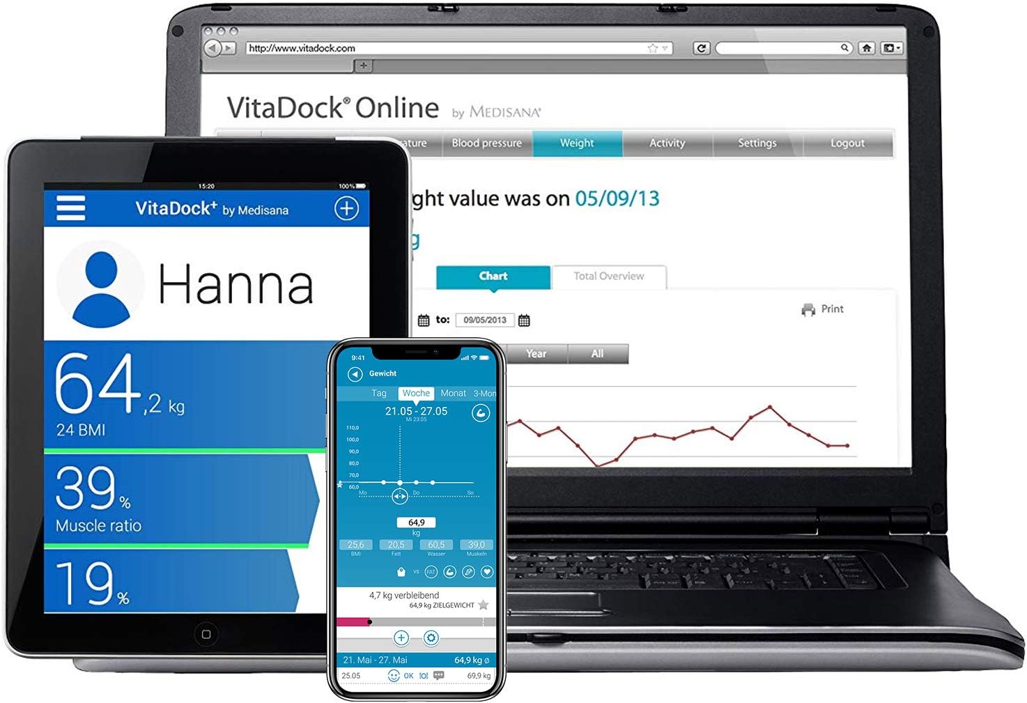 Körperanalyse: Die Personenwaage misst sowohl Gewicht als auch Körperfett, Körperwasser, Muskelmasse und Knochengewicht, errechnet den BMI-Wert und verfügt über eine integrierte Kalorienbedarfsanalyse Modernes Design: Die hochwertigen ITO-Elektroden sind hauchdünn auf die edle Oberfläche aufgedampft und damit kaum sichtbar oder spürbar. Somit wird die BS 440 zum Highlight in jedem Badezimmer Voller Funktionen: Sie können zwischen den Maßeinheiten KG, LB und ST umschalten. Die Waage erkennt bis zu 8 Nutzer automatisch, sobald sie die Waage barfuß betreten VitaDock+ App: Für eine nachhaltige Kontrolle, können die ermittelten Körperwerte per Bluetooth in die VitaDock+ App übertragen, gespeichert und analysiert werden. Hinweis: Bitte nur barfuß betreten und auf allen 4 Elektroden stehen. Nur auf flachem und hartem Boden wiegen. Die ersten Ergebnisse können abweichen, da sich die Waage kalibrieren muss | قیمت یورویی : 44.38€