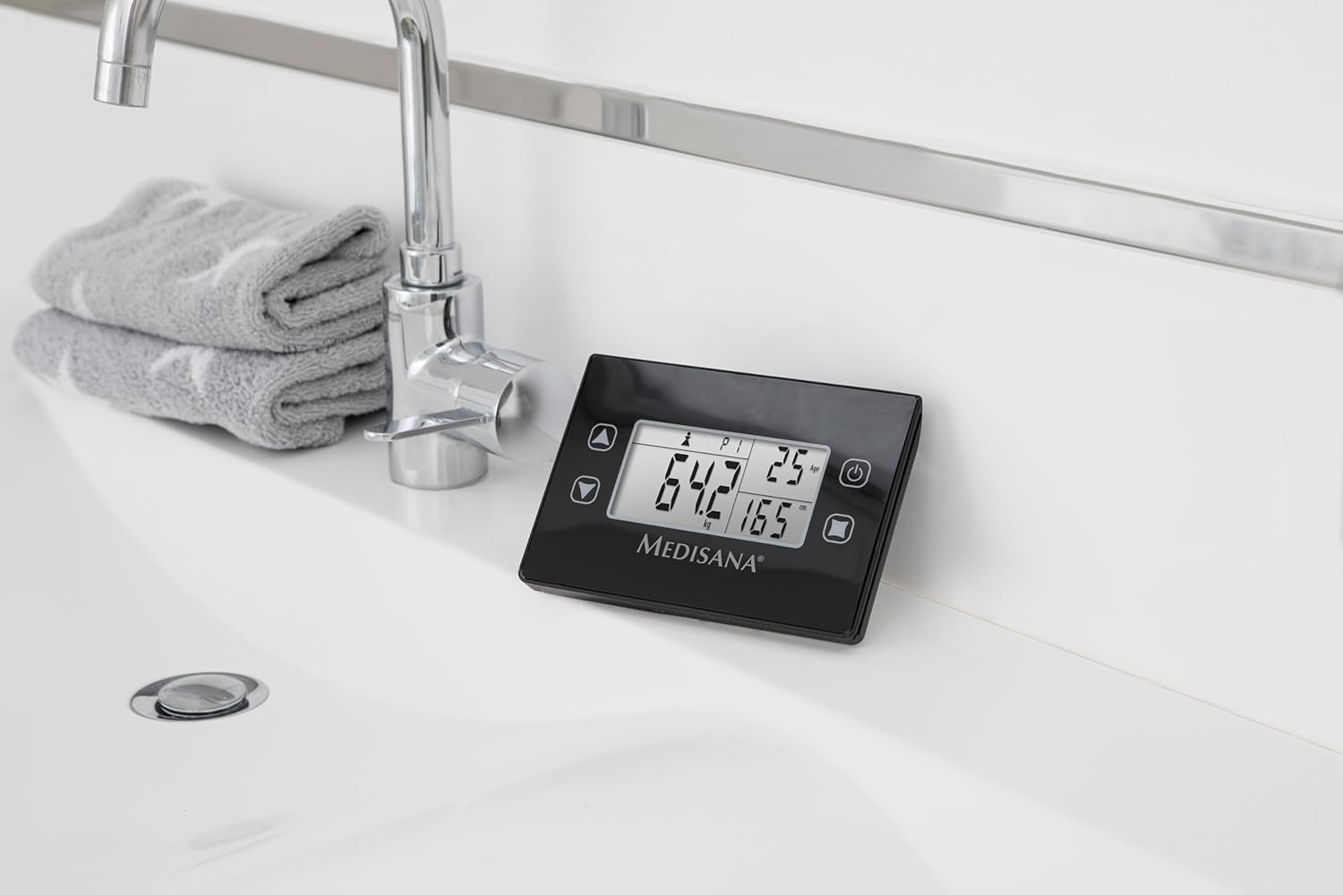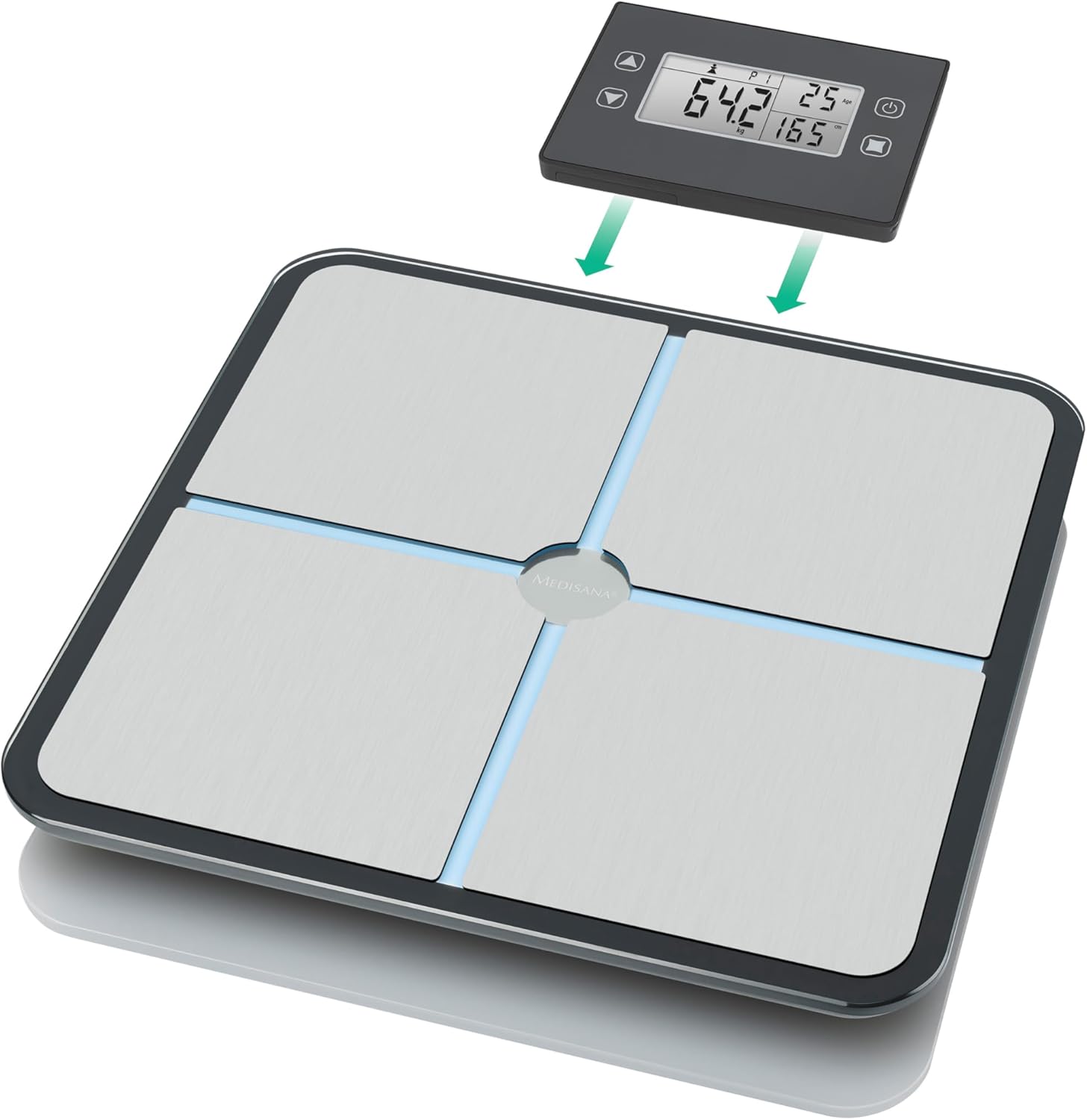 medisana BS 460 digitale Körperanalysewaage, Waage mit abnehmbarem LCD-Display, Körperfettwaage, Messung von Körperfett, Körperwasser, Muskelmasse & Knochengewicht, Bis 180 kg, Schwarz / Silber | قیمت یورویی 49.15€