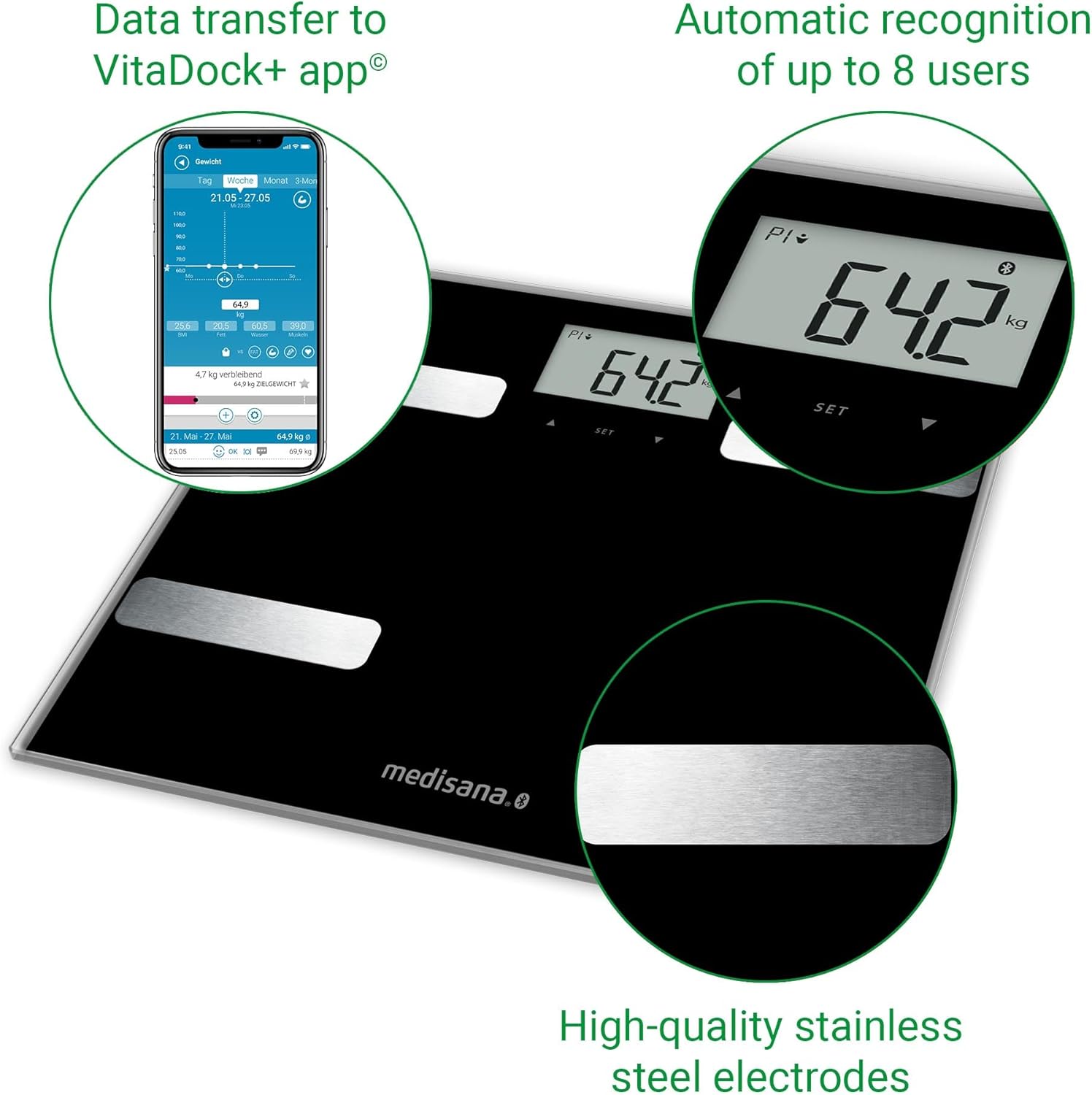 Körperanalyse: Die Personenwaage misst sowohl Gewicht als auch Körperfett, Körperwasser, Muskelmasse und Knochengewicht, errechnet den BMI-Wert und verfügt über eine integrierte Kalorienbedarfsanalyse Modernes Design: Mit ihrer schwarzen Hochglanz-Oberfläche und den hochwertigen Edelstahl-Elektroden zeigt sich in einem modernen Design. Das große LED-Display sorgt für eine leichte Lesbarkeit Voller Funktionen: Sie können zwischen den Maßeinheiten KG, LB und ST umschalten. Die Waage erkennt bis zu 8 Nutzer automatisch, sobald sie die Waage barfuß betreten. Die Körperanalysewaage kann bis zu 30 pro Benutzer Messwerte speichern und abrufen VitaDock+ App: Für eine nachhaltige Kontrolle, können die ermittelten Körperwerte per Bluetooth in die VitaDock+ App übertragen, gespeichert und analysiert werden Hinweis: Bitte nur barfuß betreten und auf allen 4 Elektroden stehen. Nur auf flachem und hartem Boden wiegen. Die ersten Ergebnisse können abweichen, da sich die Waage kalibrieren muss | قیمت یورویی : 39.99€