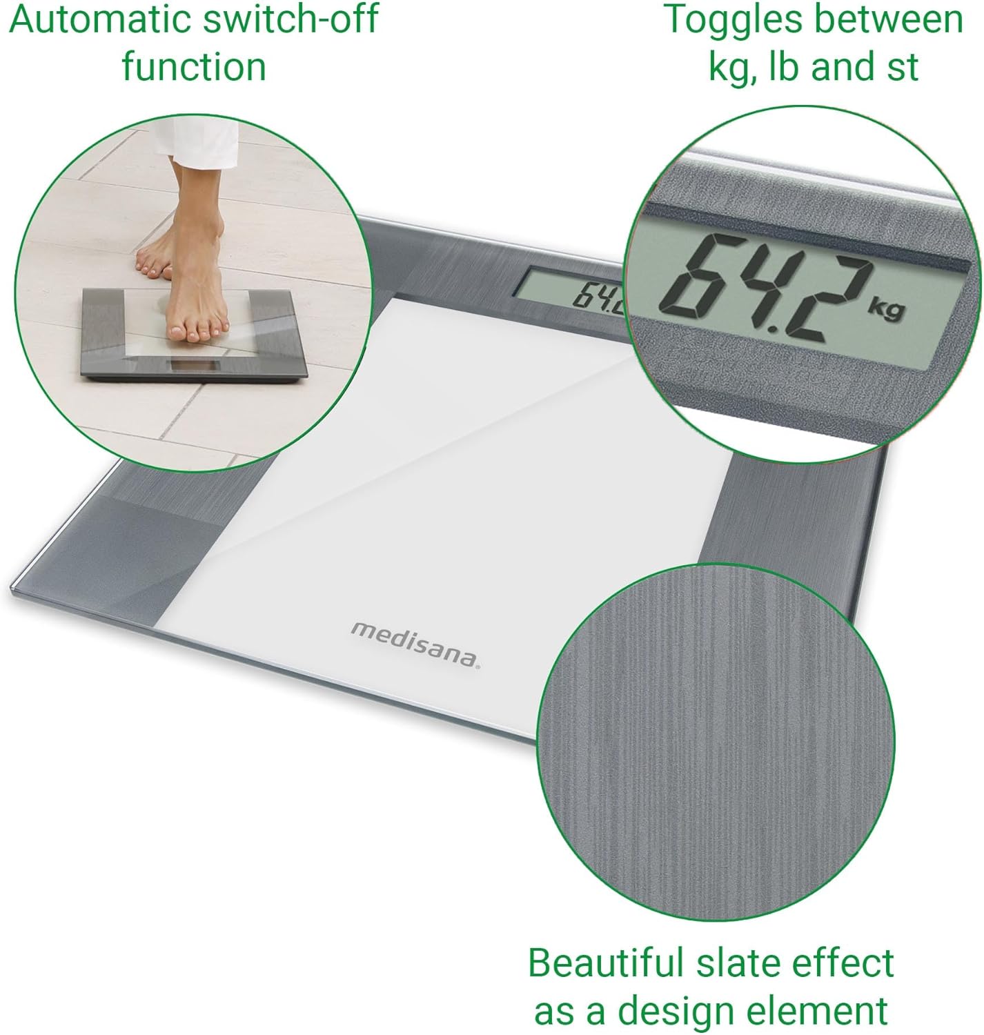 ترازوی شخصی مدیسانا PS 400، ترازوی دیجیتال بدن، ترازوی حمام برای اندازه‌گیری‌های بسیار دقیق، حسگرهای کرنش‌سنج با دقت بالا، به ویژه ترازوهای تخت، تا 150 کیلوگرم