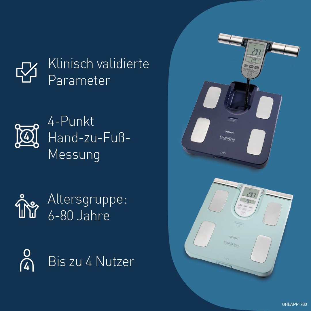 OMRON BF511 Personenwaage: Körperfettwaage mit Körperfett und Muskelmasse - 8-Sensoren mit Hand zu Fuß Messung, bis 150 kg, für Erwachsene und Kinder ab 6 Jahren. Blau 1 Stück (1er Pack) | قیمت یورویی 79.99€