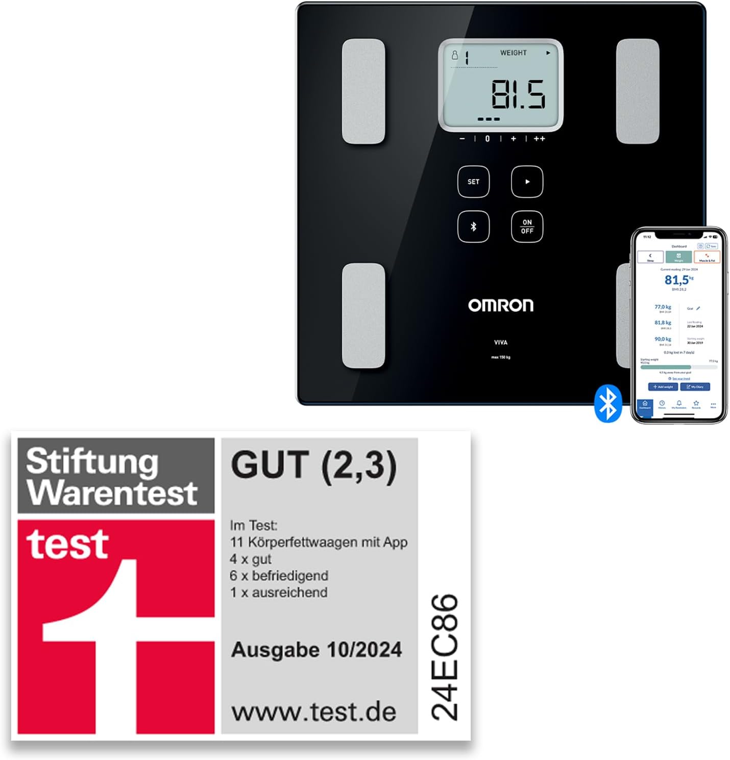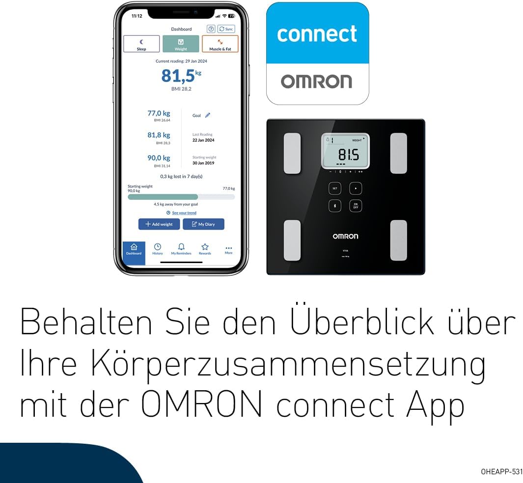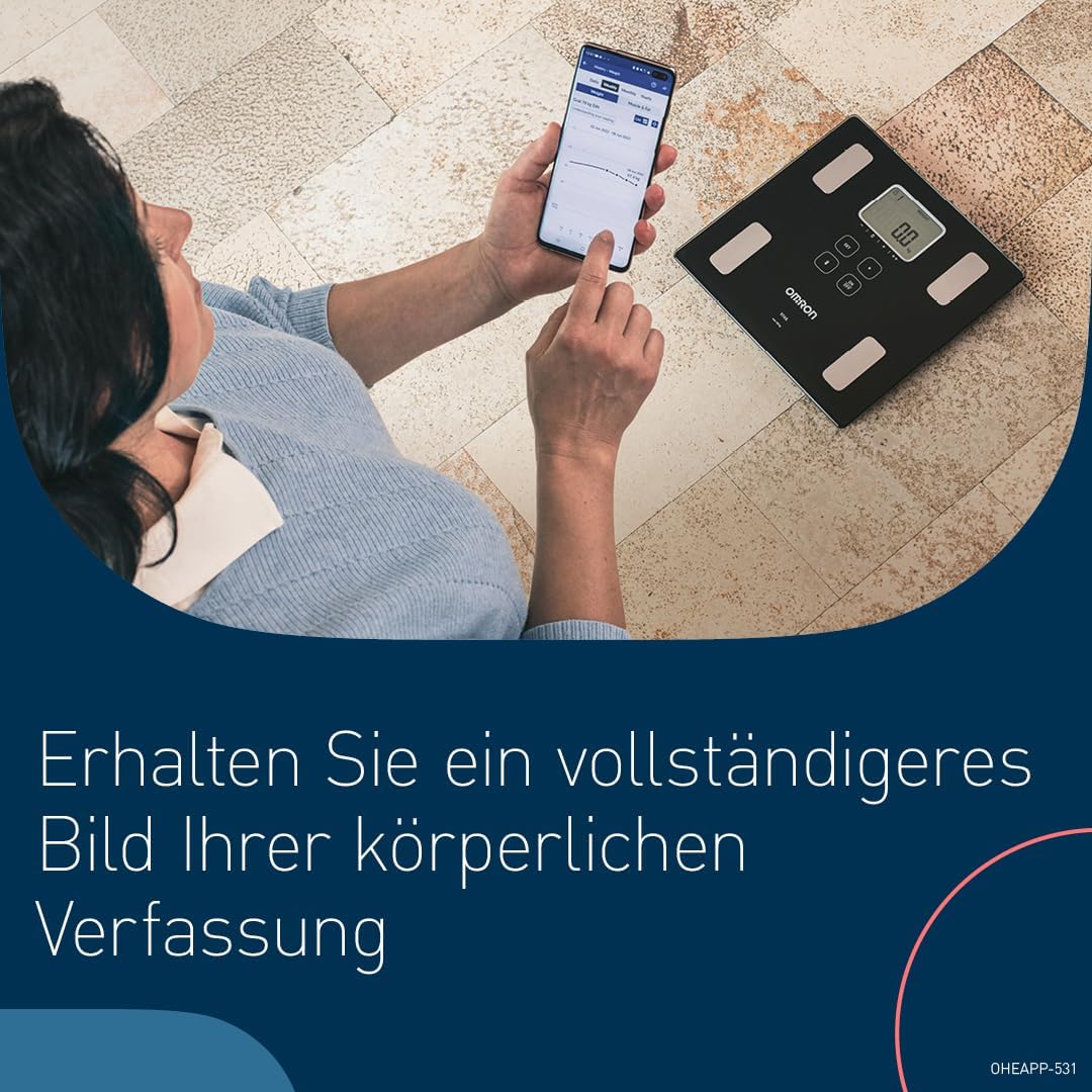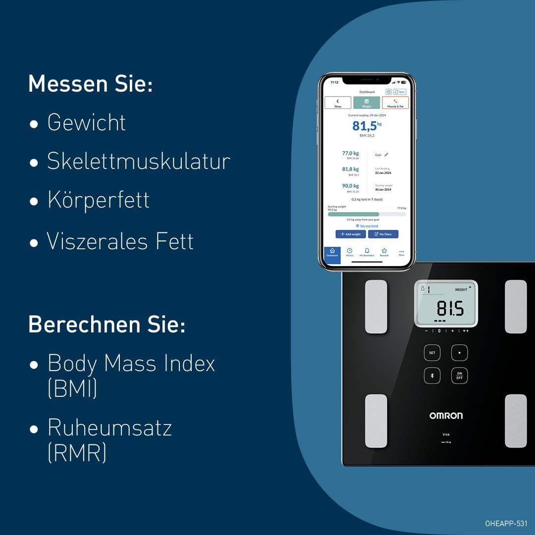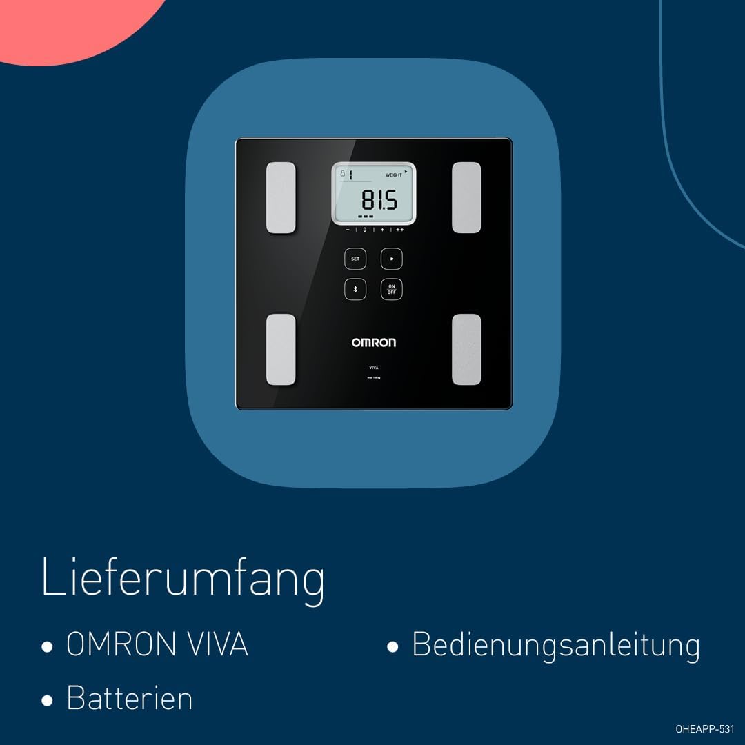 OMRON VIVA Personenwaage bietet präzise Gewichtsmessung, kombiniert mit Körperfettwaage für Viszeralfett, Muskel, Stoffwechsel, BMI sowie Herzgesundheit und Bluetooth-Sync zur OMRON Connect App | قیمت یورویی 79.99€