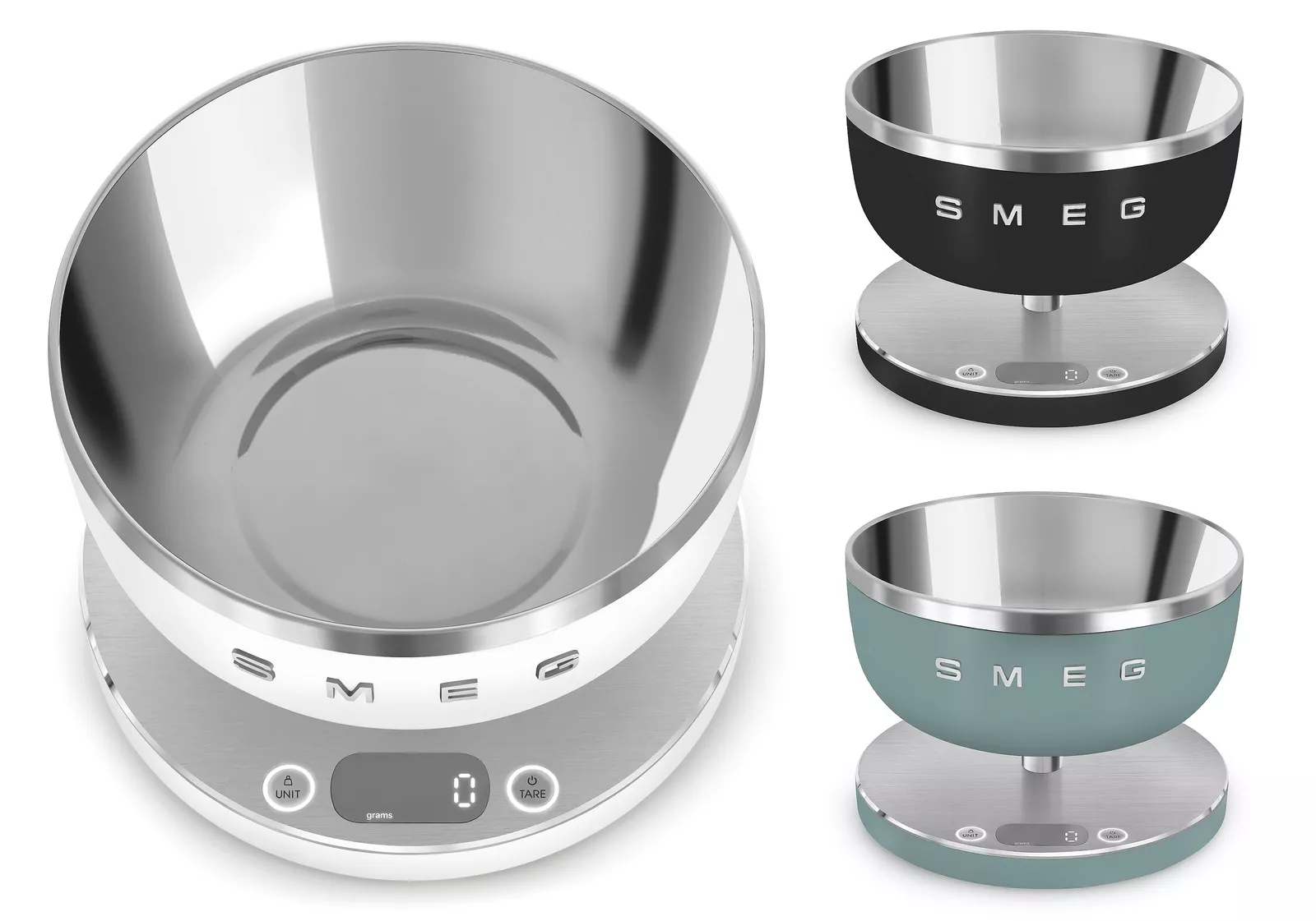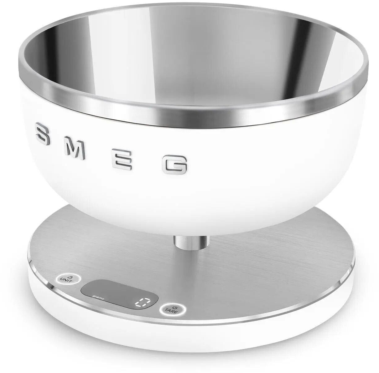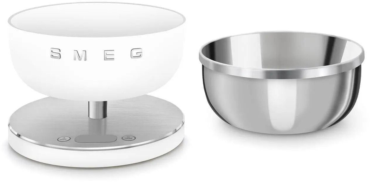 ترازوی دیجیتال اسمگ مدل KSC01، محصولی از برند ایتالیایی SMEG با طراحی کلاسیک دهه 50 میلادی و رنگ سفید، جلوهای خاص به آشپزخانه میبخشد.