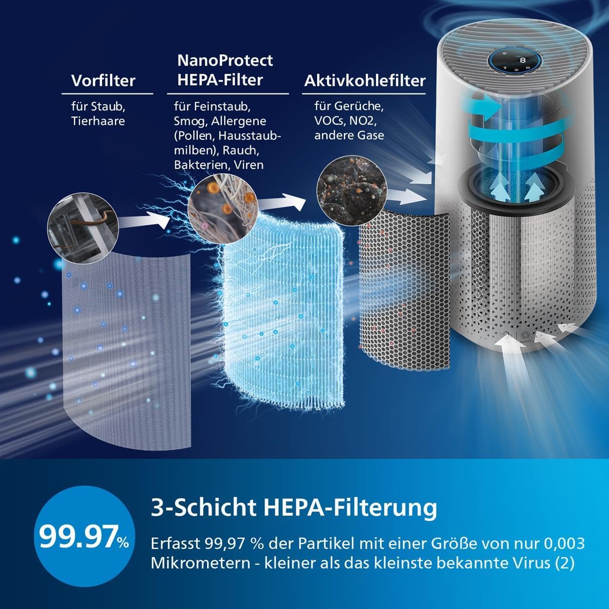 GROSSE ABDECKUNG VON BIS ZU 78 m²: mit CADR 300 m³/h, können 20 m² gereinigt werden in weniger als 10 Min (1). 3-SCHICHT-HEPA-FILTERUNG: Erfasst 99.97% % der Partikel bis zu 0.003 Mikrometer (2) - zum Schutz vor Pollen, Staub, Hausstaubmilben, Tierhaaren, Smog oder Gasen. Der Philips NanoProtect HEPA-Filter kann bis zu zweimal mehr Luft reinigen als herkömmliche (traditionell) HEPA H13-Filter (3). ZERTIFIZIERT ALLERGIEFREUNDLICH von ECARF, der Luftreiniger entfernt 99.99 % der Pollen, Hausstaubmilben und Haustierallergene (7). LEISE UND EFFIZIENT: Im Schlafmodus arbeitet er mit nur 15 dB (4). Er ist energieeffizient und verbraucht bis zu 27W zur Luftreinigung, weniger als eine herkömmliche (traditionell-) Glühbirne. SCANNEN UND VISUALISIEREN: Der professionelle Partikelsensor scannt nach Schadstoffen und wählt intelligent die richtige Geschwindigkeit. Er zeigt die Luftqualität in Echtzeit (auf dem Produktauslage und in der Air+ App). Hinweis: Wenn der Netzstecker des Luftreinigers nach dem Ausschalten nicht aus der Steckdose gezogen wird, nimmt das Gerät beim nächsten Einschalten den Betrieb basierend auf den letzten Einstellungen auf | قیمت یورویی : 169.99€