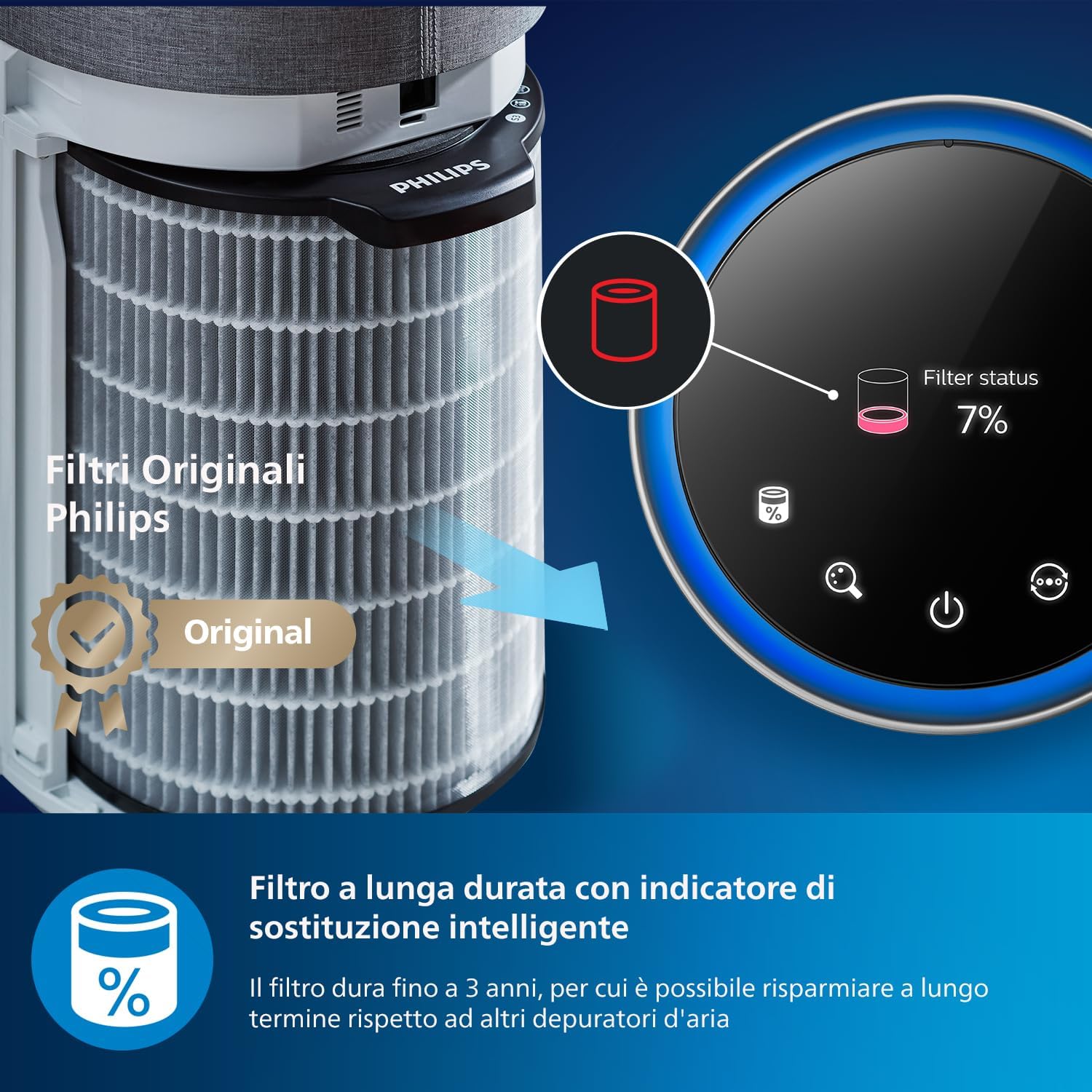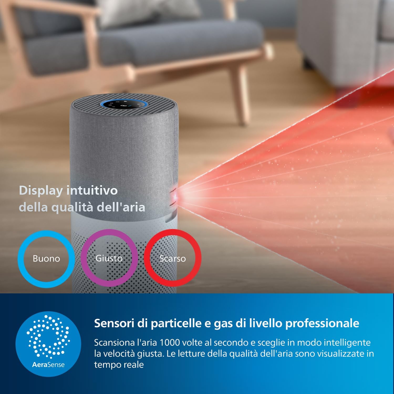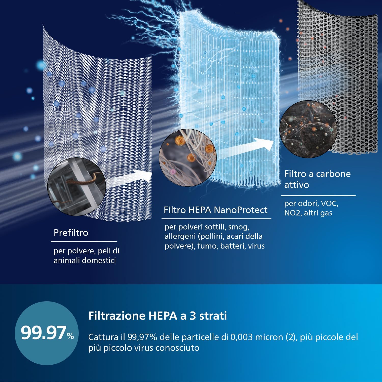 GROSSE ABDECKUNG VON BIS ZU 158 m², mit einer CADR von 610 m³/h können 20 m² in weniger als 5 Minuten gereinigt werden (1) 3-Schicht-HEPA-FILTER: Erfasst 99,97 % der Partikel bis zu 0,003 Mikrometer (2) - zum Schutz vor Pollen, Staub, Hausstaubmilben, Tierhaaren, Smog oder Gasen; Der Philips NanoProtect HEPA-Filter kann bis zu 2x mehr Luft reinigen als herkömmliche HEPA H13-Filter (3) ALLERGIEFREUNDLICH ZERTIFIZIERT von ECARF, entfernt der Luftreiniger 99,99 % der Pollen, Hausstaubmilben oder Haustierallergene (7) LEISE UND EFFIZIENT; Im Ruhezustand beträgt die Leistung nur 18 dB4; Er ist energieeffizient und verbraucht bis zu 60 W für die Luftreinigung; Dies entspricht einer normalen Glühbirne VERBINDET MIT DER AIR+ APP: So können Sie bei schlechter Luftqualität benachrichtigt werden und Ihr Gerät aus der Ferne steuern - zu Hause oder unterwegs | قیمت یورویی : 249.89€