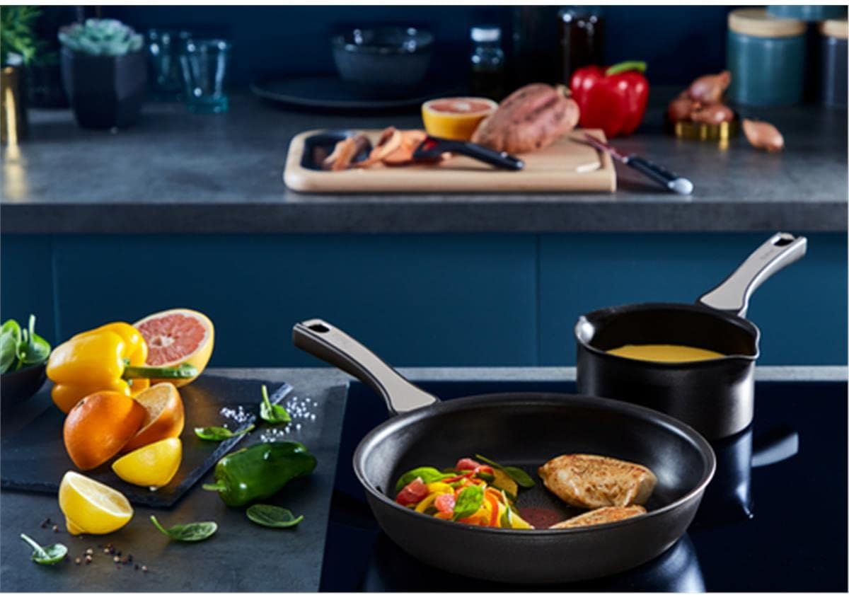 Kratzfeste Titanium-Antihaftbeschichtung: Maximal widerstandsfähige Antihaftbeschichtung für eine Bratpfanne, die keinen Bratwender fürchtet und länger hält als eine Tefal Titanium-Standardversiegelung 100 % sicher: PFOA-, Blei-, und Cadmium-frei dank strengerer Kontrollen, die über die aktuellen Bestimmungen für Materialien, die mit Lebensmitteln in Berührung kommen, hinausgehen Thermo-Signal Temperaturindikator: Zeigt mit Farbveränderung an, wann die Pfanne die ideale Brattemperatur erreicht hat, und ermöglicht perfekte Ergebnisse bei Konsistenz, Farbe und Geschmack für leckere und herzhafte Speisen jeden Tag Thermo-Fusion: Dank extragroßer Fläche und starkem Boden sorgt Thermo-Fusion für ein schnelles Erwärmen und homogene Wärmeverteilung in der Pfanne, für gleichmäßig gegarte und perfekt zubereitete Gerichte Herdkompatibilität: Geeignet für alle Herdarten, einschließlich Induktionsherde (Gas, Elektro, Keramik, Induktion); Backofengeeignet bis max. 175°C | قیمت یورویی : 60.99€