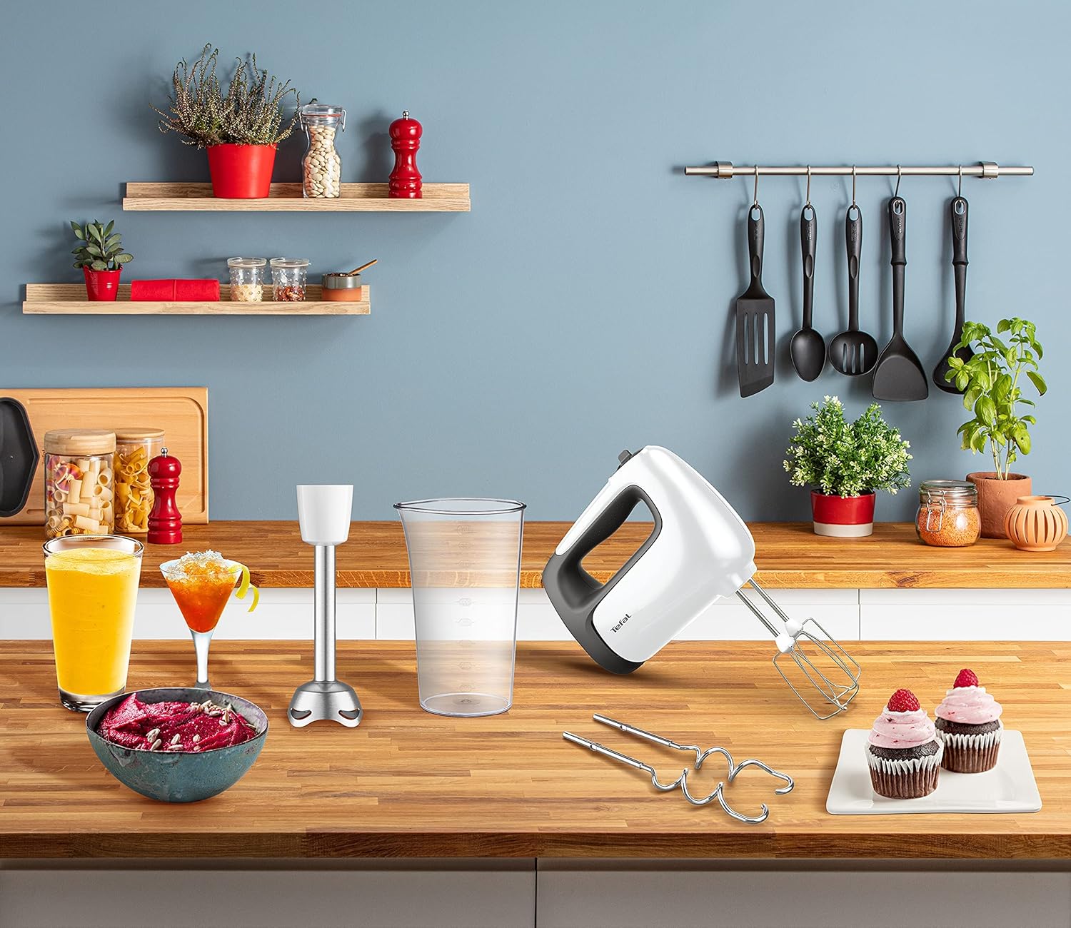 تفال HT462138 Prep'Mix + همزن دستی | ایده آل برای آماده سازی سبک و جویدنی | موتور قدرتمند 500W | 5 سرعته | عملکرد توربو | پیوست مخلوط کن فولادی ضد زنگ | سفید/خاکستری