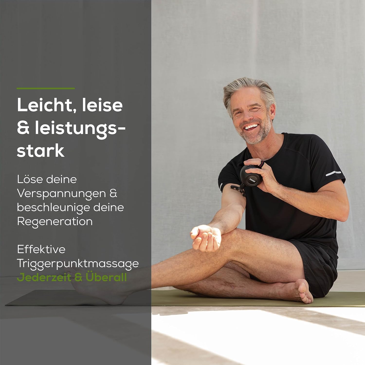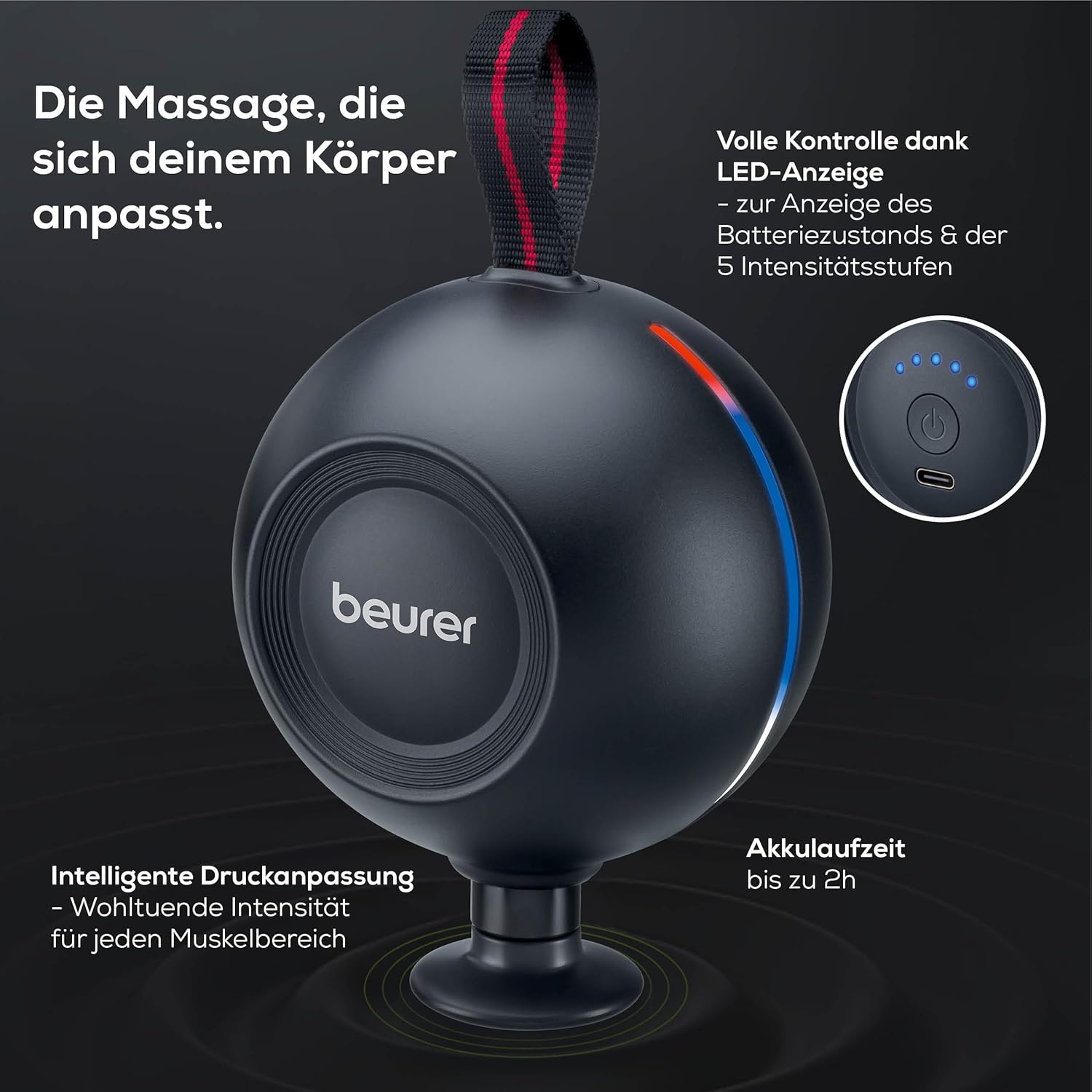 ERGONOMISCHES DESIGN: Die Beurer MG 101 Massage Gun wurde speziell für die natürliche Form der Handfläche entwickelt und bietet einen sicheren, rutschfesten Halt für eine wohltuende Muskelmassage INTEGRIERTER DRUCKSENSOR FÜR OPTIMALE INTENSITÄT: Der smarte Sensor passt die Massageintensität individuell an den jeweiligen Muskelbereich an und sorgt so für eine gezielte, effektive Muskelentspannung am ganzen Körper LED-ANZEIGE: Praktische LED-Leuchten zeigen den aktuellen Akkustand des Massageballs sowie die gewählte Intensitätsstufe an, damit das Massageerlebnis optimal gesteuert werden kann KOMPAKT, LEICHT & LEISTUNGSSTARK: Für extra Langlebigkeit, kraftvolle Triggerpunktmassagen und leisem Betriebsgeräusch mit 38 dB – ideal für Zuhause, unterwegs oder beim Training 5 HOCHWERTIGE MASSAGEAUFSÄTZE: Ob Tiefengewebsmassage, Muskelregeneration oder gezielte Triggerpunktmassage – die 5 vielseitigen Aufsätze passen sich perfekt deinen Bedürfnissen an | قیمت یورویی : 63.99€