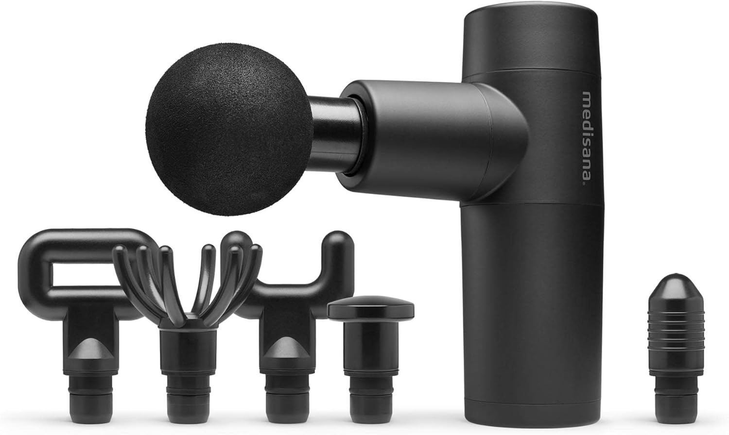 medisana MG 150 Mini Massagepistole mit 6 Massageköpfen und 5 Vibrationsstufen, Selbstmassage für Schulter, Brust, Rücken und weiteren Körperregionen mit LED-Kontrollleuchte und Aufbewahrungstasche | قیمت یورویی 59.85€