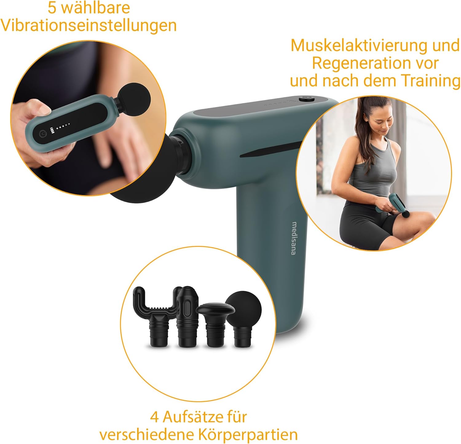 medisana MG 200 Mini Massage Gun, Massagepistole mit 4 Aufsätzen, Massagegerät mit Smart-Modus und 5 Intensitätsstufen zur Entspannung und Massage, lange Akkulaufzeit, mit Aufbewahrungsbox | قیمت یورویی 44.96€