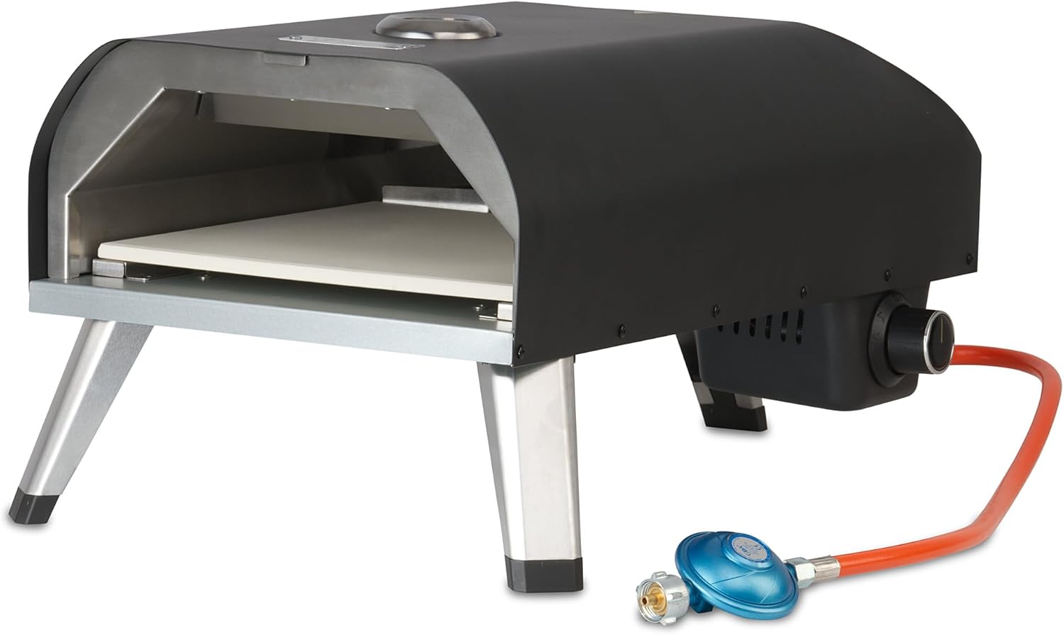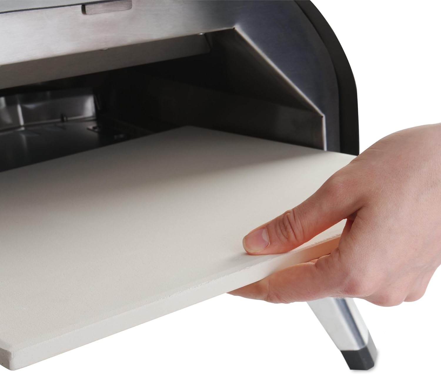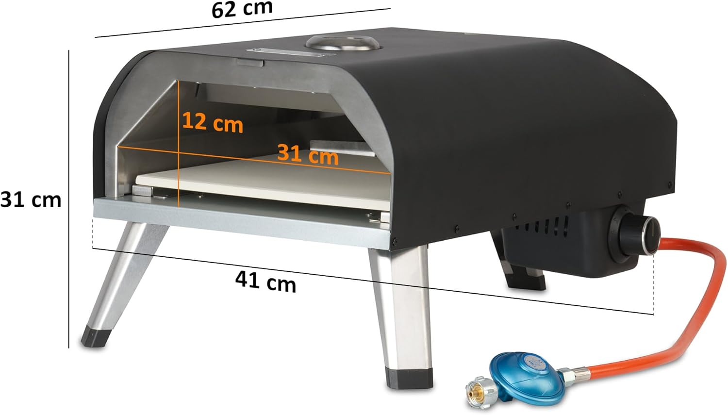 VIELSEITIG | Mit dem BBQ-Toro Pizzaofen ist es kinderleicht, Ihre Lieblingsgerichte wie Flammkuchen, leckere Pizzen und vieles mehr im Handumdrehen zuzubereiten. Zusätzlich zum Backofen ist im Lieferumfang ein herausnehmbarer Pizzastein mit den Maßen 30,5 x 30,5 cm enthalten, der durch die im Rückraum erzeugte Flamme des Heckbrenners erhitzt wird. LEISTUNG | Der Gas-Pizzaofen ist für den Einsatz mit Propan/Butan-Gasen ausgelegt und arbeitet bei einem Gasdruck von 50 mbar. Mit einer eindrucksvollen Leistung von 4 kW und einem sparsamen Gasverbrauch von nur 291 g/h können Sie sicher sein, dass Ihr Gas-Pizzaofen stets bereit ist, knusprige Pizzen und andere Köstlichkeiten zu zaubern. PIEZOZÜNDUNG | Die Piezozündung des Ofens ermöglicht eine einfache und zuverlässige Inbetriebnahme. Kein lästiges Hantieren mit Streichhölzern oder Feuerzeugen mehr. Mit nur einem Knopfdruck ist Ihr Ofen einsatzbereit und bringt Sie dem Genuss Ihrer Lieblingspizza einen Schritt näher. EINFACHES BEDIENEN | Mit den intuitiven Bedienelementen und einem mühelosen Regler ist der Gas-Pizzaofen einfach zu bedienen. Sowohl erfahrene Köche als auch Hobbybäcker werden die Benutzerfreundlichkeit schätzen und spielend leicht köstliche Pizzen zaubern können. SICHERHEIT | Der Ofen besteht aus hochwertigem Stahl und ist mit klappbaren, rutschfesten Füßen ausgestattet, die für sicheren Stand sorgen. Zudem verfügt der Gasgrill über einen geräumigen Innenraum und eine große Öffnung von (B) 31 x (H) 12 cm, damit Sie Ihre Pizza immer im Auge behalten können. | قیمت یورویی : 144.95€