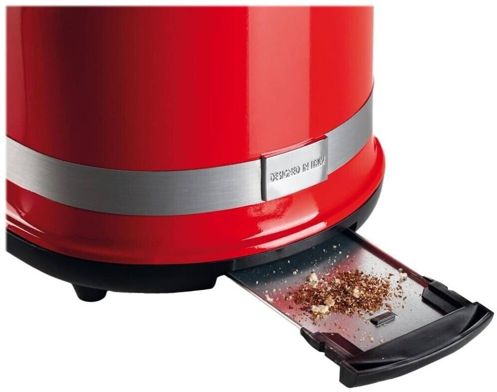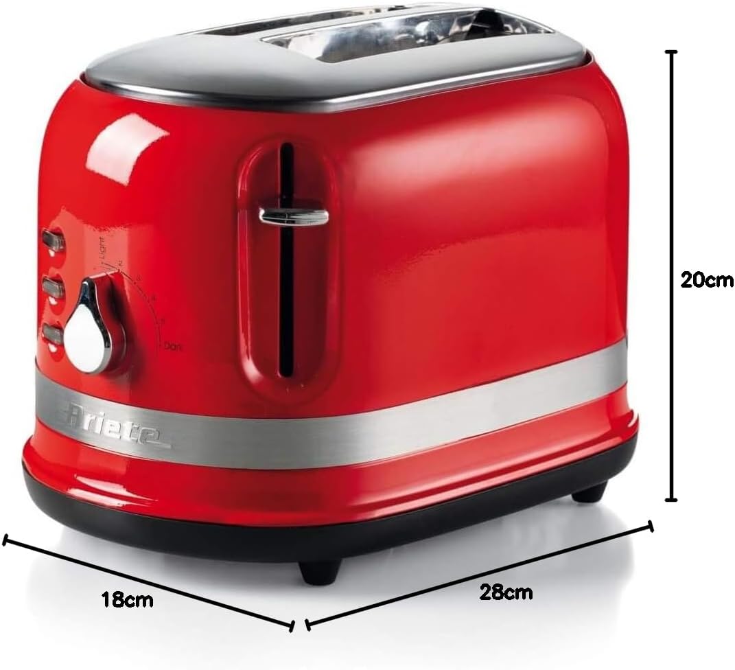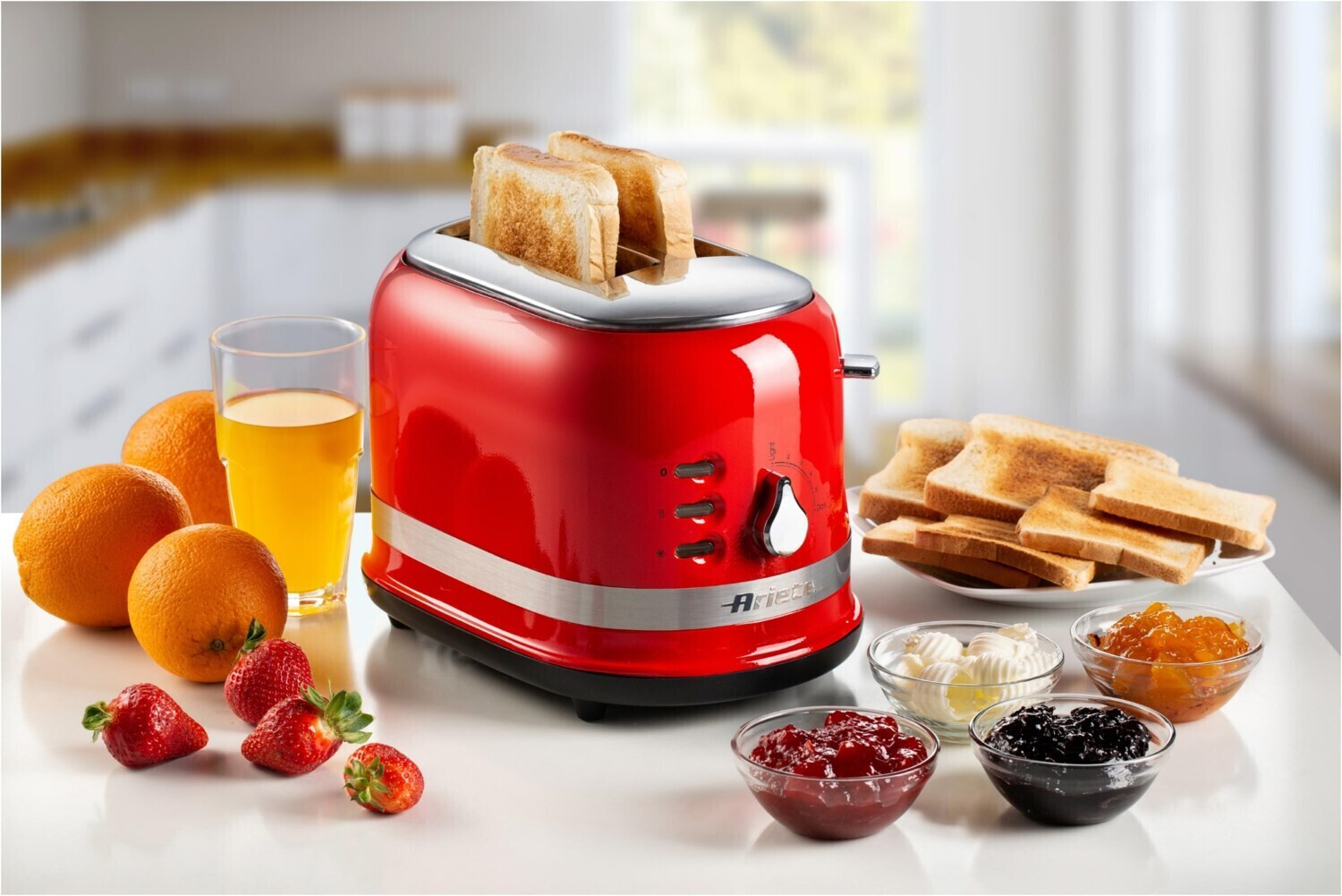 توستر آریته مدل 0149R با طراحی کلاسیک سری مودرنا، رنگ قرمز براق و دو شیار نان، مناسب برشتهکردن سریع و یکنواخت نان صبحانه است.