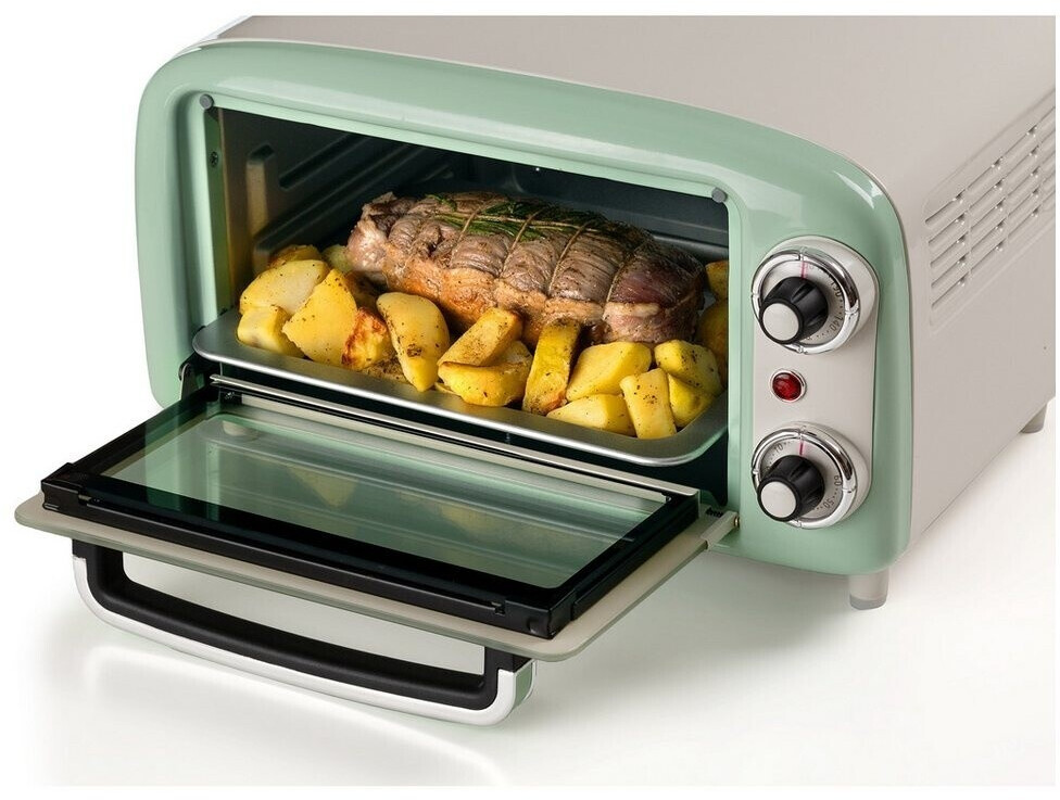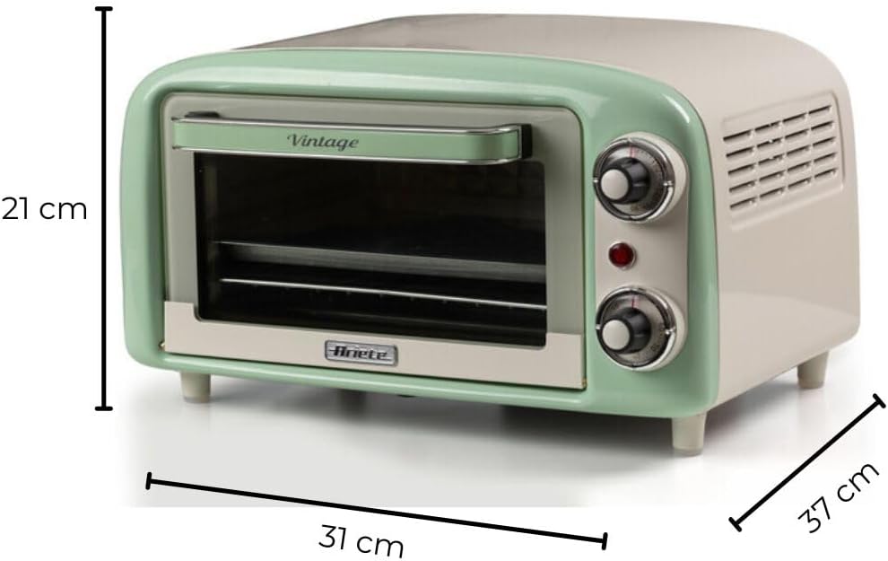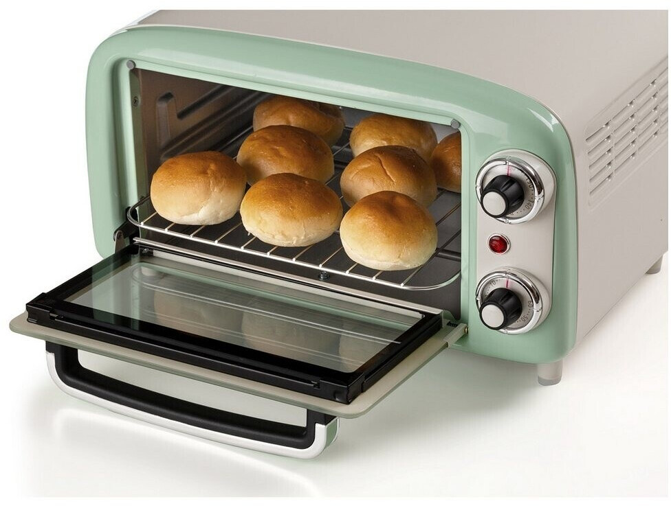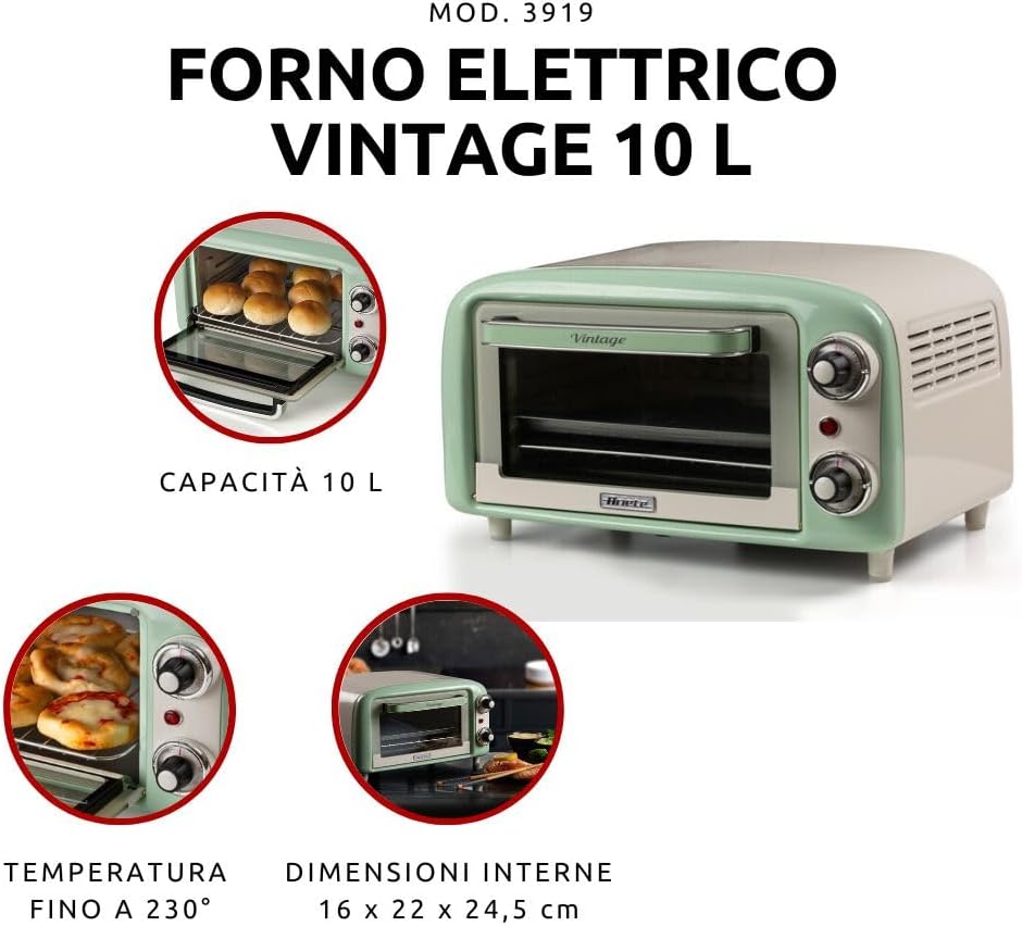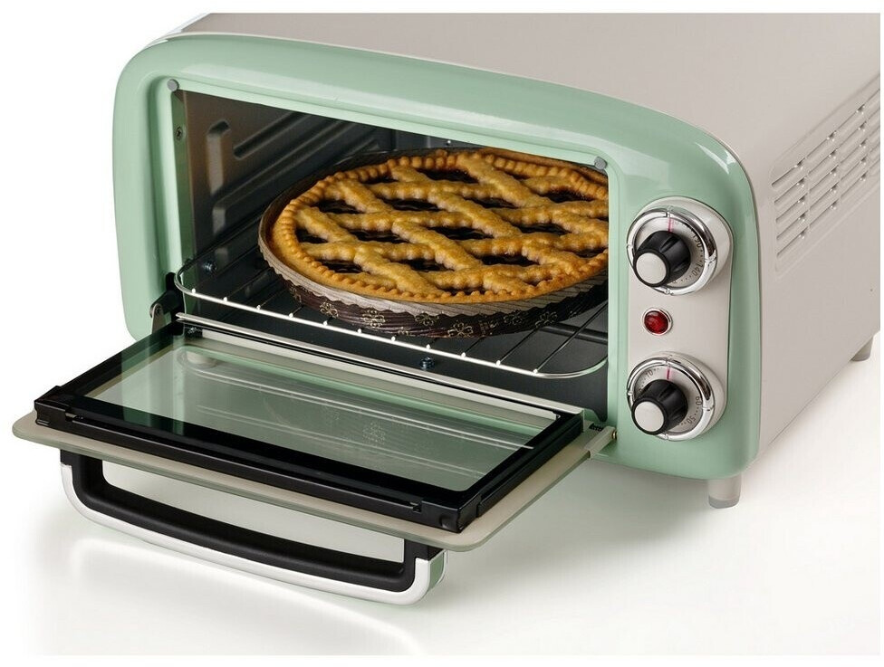 توستر برقی Ariete 3919/04 با طراحی رترو و رنگ سبز، دارای ظرفیت ۱۸ لیتر، تایمر ۶۰ دقیقهای و المنت حرارتی بالا و پایین است. مناسب پخت، گریل و گرم کردن غذا.