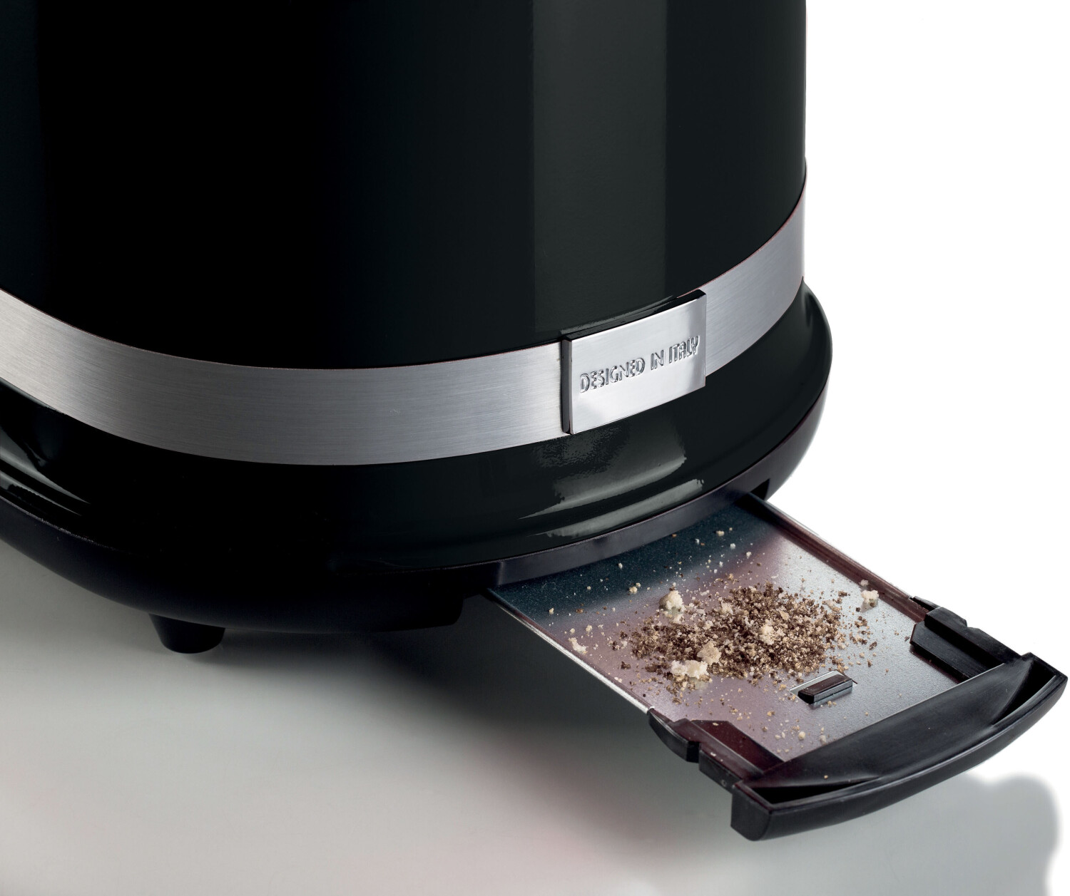 توستر مشکی با طراحی ساده و کاربردی، دارای دو شیار و قابلیت یخزدایی و گرمکردن مجدد.