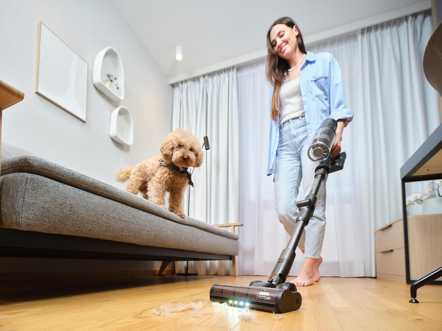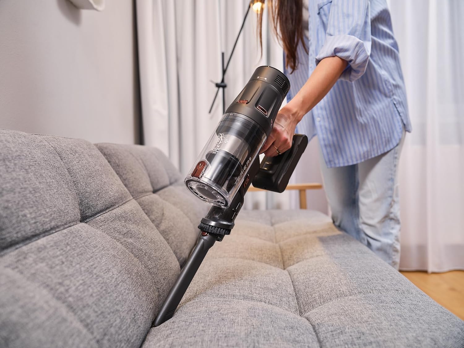 3-IN-1 STABSTAUBSAUGER MIT LEISTUNGSSTARKEM 500W DIGITALMOTOR. Dieser Stabstaubsauger bietet eine 3-in-1-Funktionalität und ist mit einem 500W Digitalmotor ausgestattet, der für eine herausragende Saugleistung sorgt. Dank der SMART DUST SENZOR-Technologie passt der Staubsauger die Saugkraft automatisch an das Niveau der Verschmutzung an, sodass er immer optimal arbeitet. TECHNOLOGIE ZUR HAAR- UND FELLENTFERNUNG. Die speziell entwickelte Bodendüse verfügt über eine Funktion zur Vermeidung von Haaren und Tierhaaren, die sich während des Saugens aufwickeln. Dadurch bleibt die Düse jederzeit effizient und muss weniger oft gereinigt werden. EXTRA STARK, AUSTAUSCHBARE BATTERIE FÜR LANGE LAUFZEIT. Mit der austauschbaren und besonders starken Lithium-Ionen-Batterie kann der Staubsauger bis zu 80 Minuten lang mit einer einzigen Ladung betrieben werden. So können Sie Ihr Zuhause gründlich reinigen, ohne ständig aufladen zu müssen. VIELSEITIGES ZUBEHÖR FÜR HAUSTIERPFLEGE. Das Gerät wird mit einer Vielzahl von nützlichem Zubehör geliefert, darunter Aufsätze, die speziell für die Pflege von Haustierfell entwickelt wurden. Dazu gehören unter anderem eine Unterfellbürste, eine Entwirrungsbürste und eine Auffrischungsbürste, um die Bedürfnisse Ihrer Tiere zu erfüllen. OLED-TOUCHSCREEN UND FLEXIBILITÄT. Der Stabstaubsauger verfügt über einen modernen OLED-Touchscreen, der den aktuellen Saugkraftstatus und den Batteriestand in Prozent anzeigt. Zusätzlich ermöglicht der flexible Gelenkmechanismus eine Reichweite von bis zu 60 cm, sodass Sie auch schwer erreichbare Stellen problemlos reinigen können. | قیمت یورویی : 299.99€