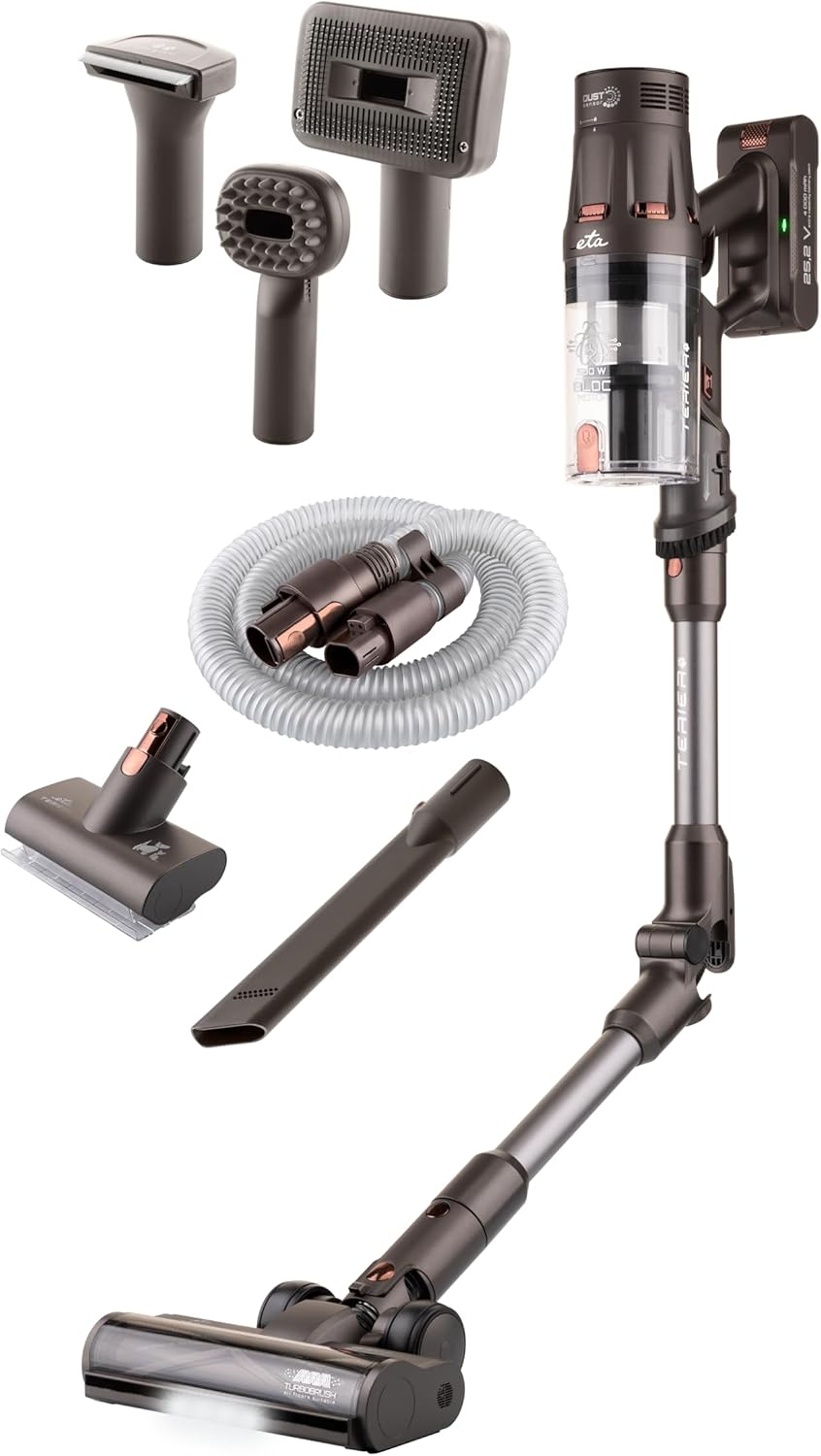جاروبرقی دستی و عصایی ETA مدل Terier | لیتیوم-یون ۲۵.۲ VI، زمان کارکرد تا ۸۰ دقیقه | ۲× فیلتر HEPA | ظرف گرد و غبار 0.5 لیتری | صفحه لمسی OLED | موتور دیجیتال | حسگر گرد و غبار هوشمند