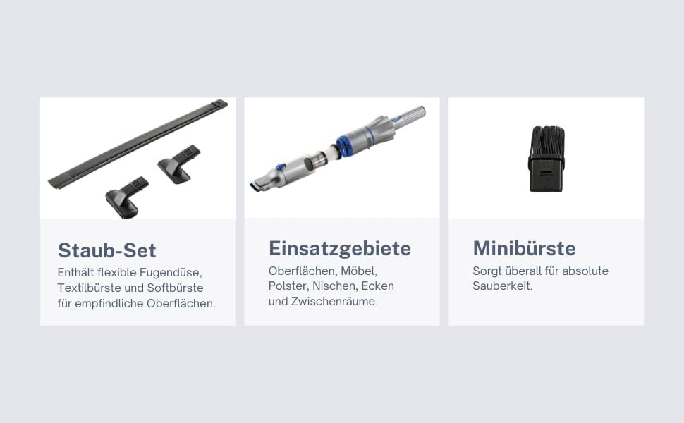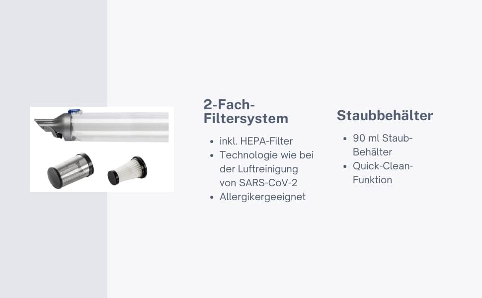 Der leichte Hand- und Bodenstaubsauger (0,5 kg Gewicht) eignet sich für alle gewünschten Oberflächen, Nischen, Ecken und Zwischenräume, mit dem One-Klick-Brush Bürstenaufsatz sogar für empfindliche Oberflächen Das praktische Zubehör bestehend aus der Fugendüse, der flexiblen Fugendüse, Textilbürste und Softbürste reinigt hinter dem Kühlschrank, hinter der Heizung und problemlos Polster, Matratzen und Autositze Der 14,8 V Lithium-Ionen-Akku garantiert eine Laufzeit von bis zu 20 Minuten und bietet sich deshalb perfekt zur Autoreinigung an, da der Sauger kabellos und ohne Beutel ist Das effektive 2-fach-Filtersystem inkl. HEPA-Filter filtert Viren aus der Luft, zudem feine Partikel wie Pollen, Hausstaubmilben & Tierhaare, welche kontaktlos aus dem Staubbehälter entleert werden können Das Set enthält: 1x Hauptgerät, 1x Staub-Behälter (90 ml), 1x Bürstenaufsatz, 2x HEPA-Filter, 1x Edelstahl 18/10 Filter, 1x Ladestation, 1x Fugendüse, 1x Ladekabel, 1x Flexible Fugendüse (ca. 63 cm), 1x Textilbürste, 1x Softbürste | قیمت یورویی : 129.7€