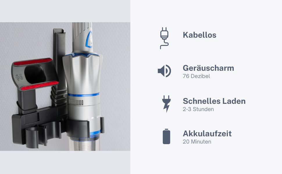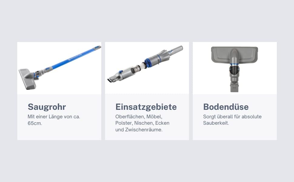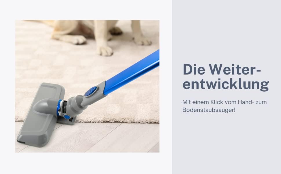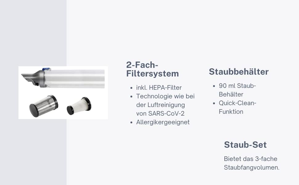 Durch das Boden-Set verwandelt sich der Handstaubsauger in einen leistungsstarken Bodenstaubsauger und ist durch den Hochleistungs-BLDC-Motor mit 90 Watt & 3-facher Saugkraft besonders leistungsstark Das praktische Zubehör bestehend aus der Fugendüse, der flexiblen Fugendüse, Textilbürste und Softbürste reinigt hinter dem Kühlschrank, hinter der Heizung und problemlos Polster, Matratzen und Autositze Der 14,8 V Lithium-Ionen-Akku garantiert eine Laufzeit von bis zu 20 Minuten und bietet sich deshalb perfekt zur Autoreinigung an, da der Sauger (0,5 kg) kabellos und ohne Beutel ist Das effektive 2-fach-Filtersystem inkl. HEPA-Filter filtert Viren aus der Luft, zudem feine Partikel wie Pollen, Hausstaubmilben & Tierhaare, welche kontaktlos aus dem Staubbehälter entleert werden können Das Set enthält: 1x Hauptgerät, 1x Staub-Behälter (90 ml), 1x Bürstenaufsatz, 2x HEPA-Filter, 1x Edelstahl 18/10 Filter, 1x Ladestation, 1x Fugendüse, 1x Ladekabel, 1x Flexible Fugendüse (ca. 63 cm), 1x Textilbürste, 1x Softbürste, 1x Bodendüse, 1x Saugrohr (ca. 65 cm), 1x Minibürste | قیمت یورویی : 139.95€