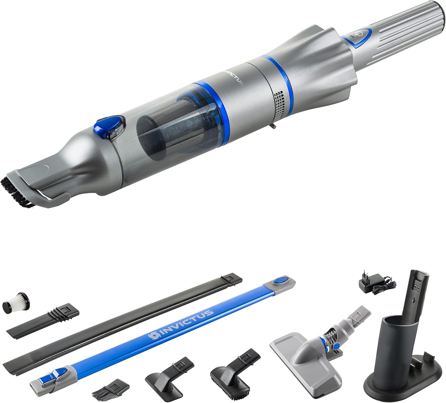 جاروبرقی دستی Genius A82123، Invictus One 2.0 + جاروبرقی کف جاروبرقی دستی 15 تکه آبی بدون کیسه و شارژی با 13000PA | 2 عدد فیلتر HEPA، باتری لیتیوم یون، مجموعه برس اضافی، 90 وات