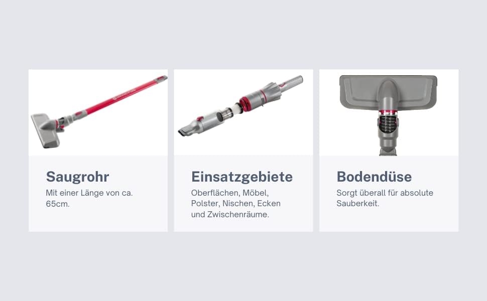 Durch das Boden-Set verwandelt sich der Handstaubsauger in einen leistungsstarken Bodenstaubsauger und ist durch den Hochleistungs-BLDC-Motor mit 90 Watt & 3-facher Saugkraft besonders leistungsstark Das praktische Zubehör bestehend aus der Fugendüse, der flexiblen Fugendüse, Textilbürste und Softbürste reinigt hinter dem Kühlschrank, hinter der Heizung und problemlos Polster, Matratzen und Autositze Der 14,8 V Lithium-Ionen-Akku garantiert eine Laufzeit von bis zu 20 Minuten und bietet sich deshalb perfekt zur Autoreinigung an, da der Sauger (0,5 kg) kabellos und ohne Beutel ist Das effektive 2-fach-Filtersystem inkl. HEPA-Filter filtert Viren aus der Luft, zudem feine Partikel wie Pollen, Hausstaubmilben & Tierhaare, welche kontaktlos aus dem Staubbehälter entleert werden können Das Set enthält: 1x Hauptgerät, 1x Staub-Behälter (90 ml), 1x Bürstenaufsatz, 2x HEPA-Filter, 1x Edelstahl 18/10 Filter, 1x Ladestation, 1x Fugendüse, 1x Ladekabel, 1x Flexible Fugendüse (ca. 63 cm), 1x Textilbürste, 1x Softbürste, 1x Bodendüse, 1x Saugrohr (ca. 65 cm), 1x Minibürste | قیمت یورویی : 159.94€