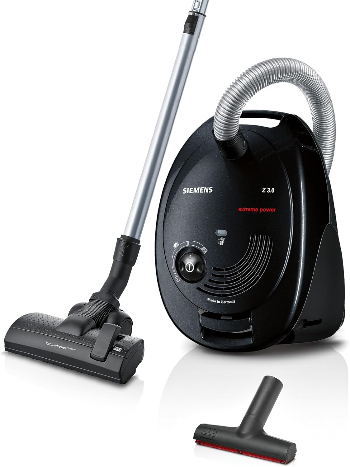 Siemens Staubsauger mit Beutel Z 3.0 extreme power VSZ3XTRM11, Bodenstaubsauger, XXL-Polsterdüse ideal für Tierhaare, Bodendüse für Parkett, Teppich, Fliesen, niedriger Stromverbrauch, 850 W, schwarz Schwarz Extreme Power 850 Watt keine Parkettdüse Single | قیمت یورویی 99.99€