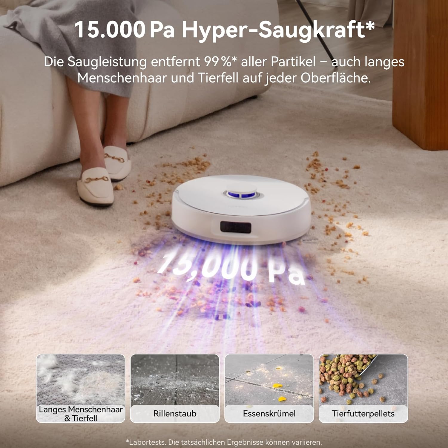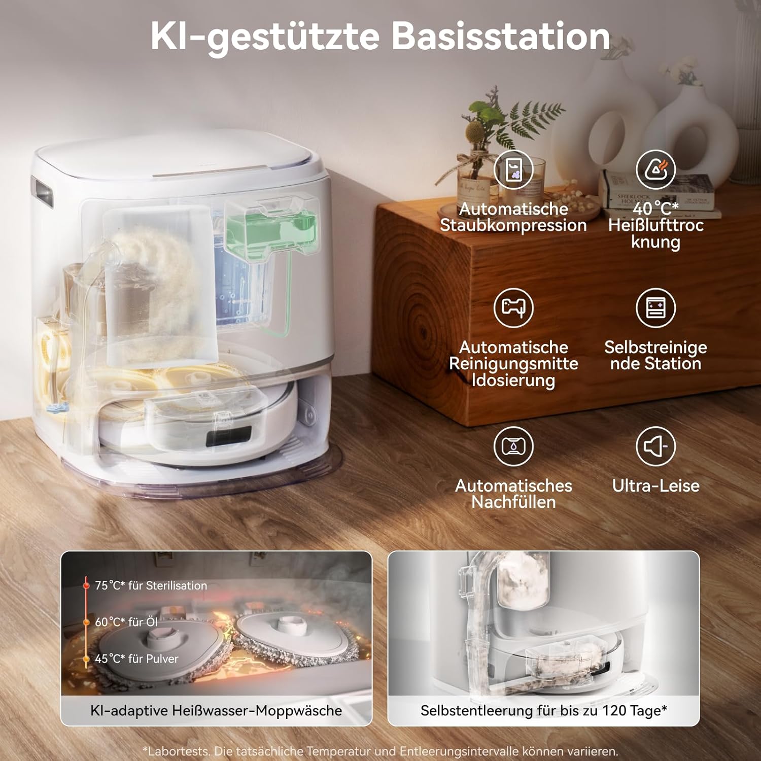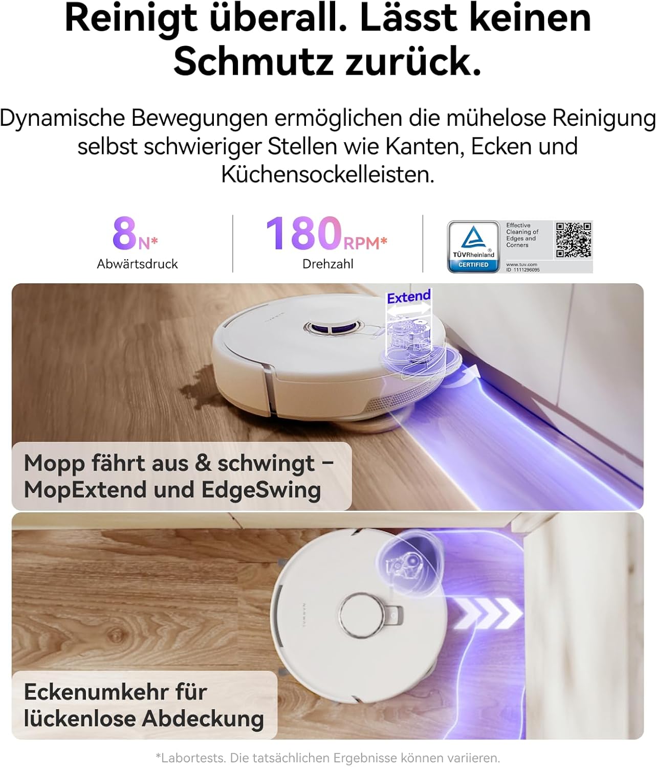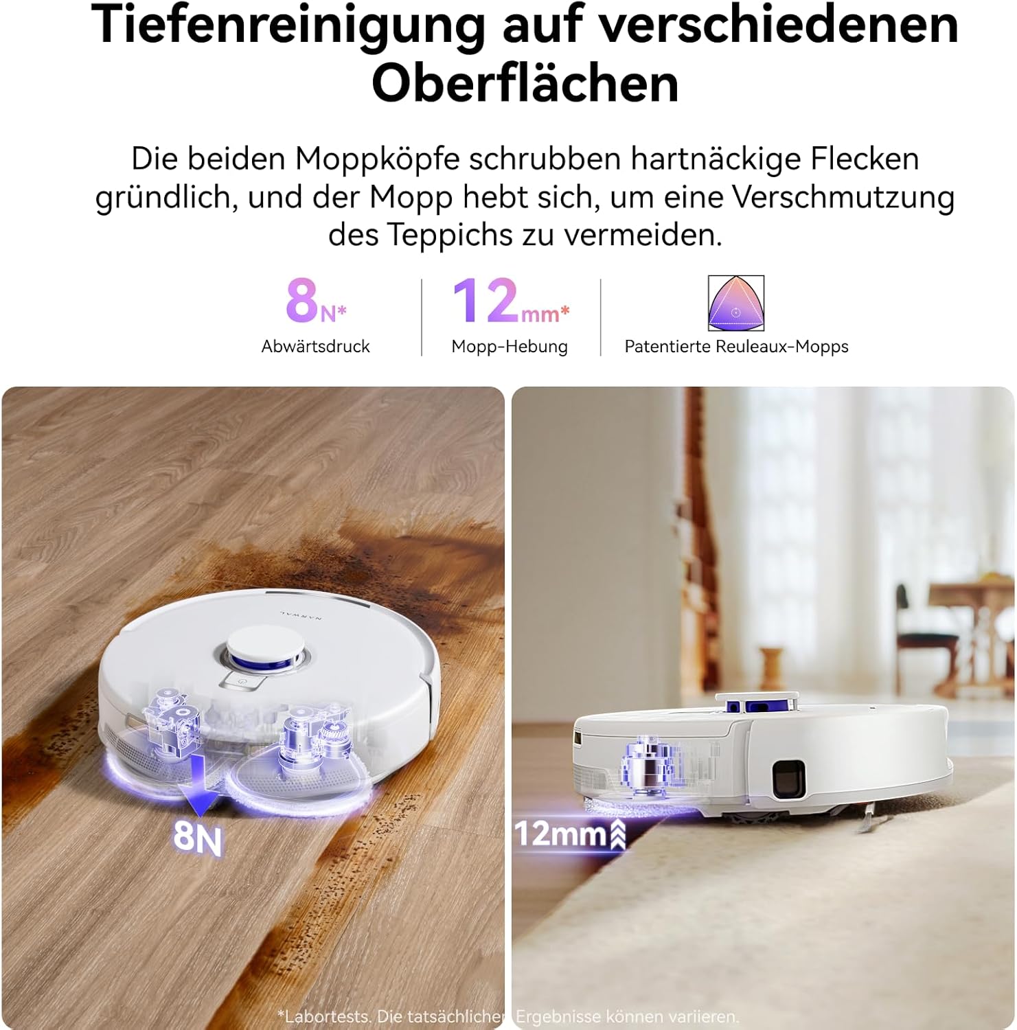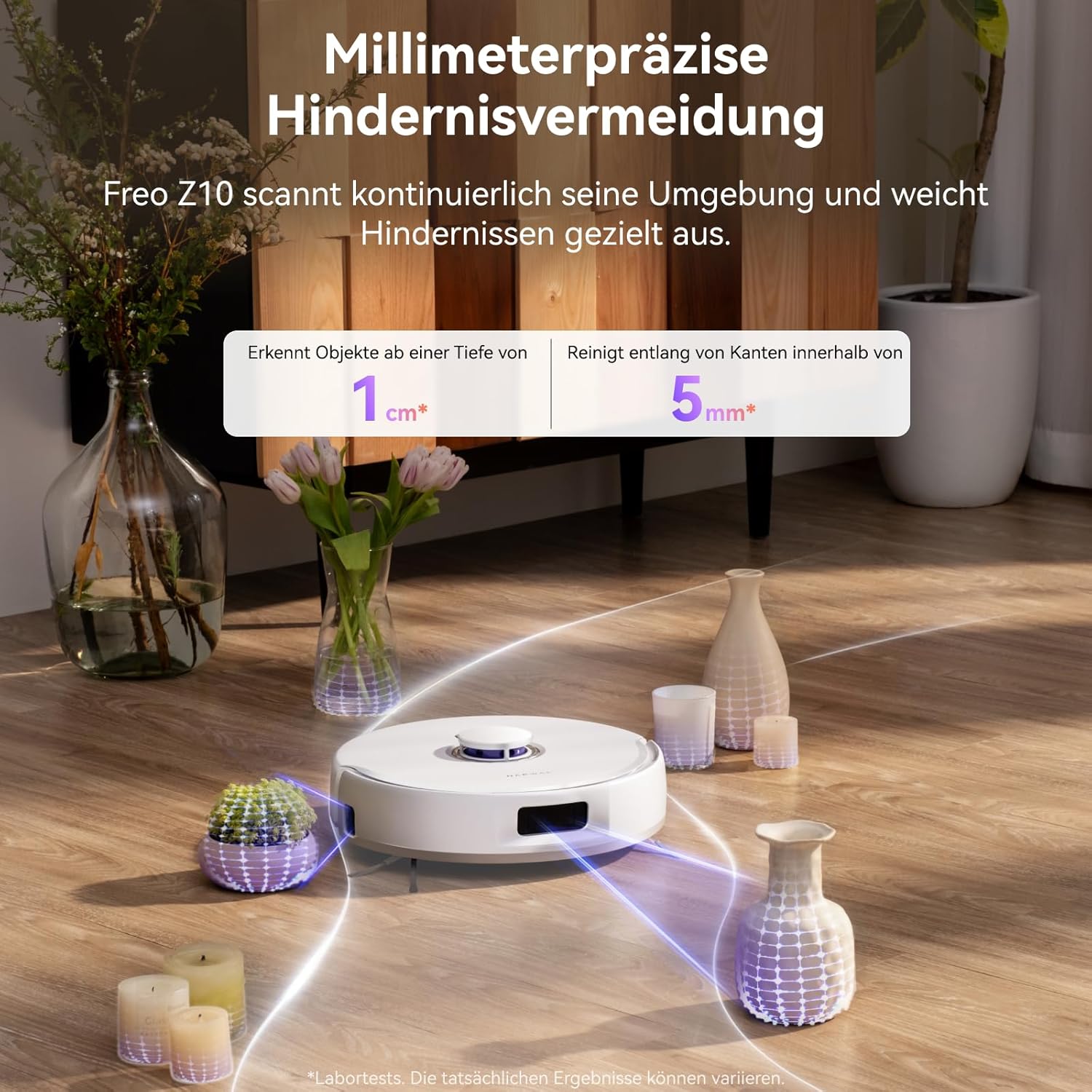 DualFlow Tangle-Free System: Der Freo Z10 Staubsauger Roboter verhindert gekonnt das Verheddern der Seitenbürsten und der Walzenbürste und erleichtert so die Wartung. Die Seitenbürsten lösen Haare durch dynamische Bewegungen, die dann nahtlos auf die Walzenbürste übertragen werden. Ein Saugstoß zieht die Haare mühelos in den Staubbehälter. Reinigt schwer zugängliche Stellen: Der Freo Z10 Saugroboter mit Wischfunktion nutzt dynamische Moppverlängerung und EdgeSwing-Technologie, um selbst Ecken und Kanten präzise zu erreichen. Mit einer nach unten gerichteten Kraft von 8 N entfernt er hartnäckige Verschmutzungen – mühelos sogar unter Küchenunterschränken. Selbstwartende Basisstation – Die leise, aber leistungsstarke Basisstation ist das intelligente Herzstück des Systems – sie erledigt ihre Aufgaben effizient, ohne dich zu stören. Nach jeder Reinigung führt der Freo Z10 Saug WischRoboter mit Selbstreinigung eine Heißwasser-Moppwäsche, eine Selbsttrocknung sowie eine automatische Selbstreinigung durch. Und der Staub? Der wird ganz von selbst für bis zu 120 Tage entleert – für minimalen Wartungsaufwand und maximale Zufriedenheit. 15.000Pa Hyper-Saugkraft - Der Freo Z10 Saug- und Wischroboter bietet eine außergewöhnlich starke Saugkraft von 15.000Pa, um selbst hartnäckigen Schmutz zuverlässig zu entfernen – und erreicht dabei eine Entfernungsrate von 99% aller Schmutzpartikel. Dank des intelligenten Partikelsensors trifft der Roboter in Echtzeit Reinigungsentscheidungen, analysiert den Boden auf Schmutzart und -verteilung, verhindert die Verbreitung von Schmutz und sorgt dafür, dass deine Böden – bis in die kleinste Fuge – makellos sauber bleiben. Mühelos durch jede Wischaufgabe – Mit automatisch zielgerichteter Reinigung und dual rotierenden Mopps, die das manuelle Schrubben nachahmen, beseitigt der Freo Z10 Wischroboter selbst hartnäckige Flecken wie Kaffee, Marmelade oder sogar 72 Stunden eingetrockneten Ketchup – ganz ohne Aufwand. Nach dem Wischen überwacht die integrierte DirtSense-Technologie die Farbe des Schmutzwassers, um zu erkennen, ob weitere Reinigung notwendig ist. Millimetergenaue Hindernisvermeidung: Front- und Seitensensoren arbeiten zusammen, um Hindernisse in der Wohnung zu erkennen und zu umfahren, sodass auch Randbereiche gründlich gereinigt werden. Intelligente Sprachsteuerung – unterstützt Alexa, Siri und Google Home, sodass sich die Smart-Home-Einstellungen ganz einfach umsetzen lassen. Präzise Navigation mit LiDAR 4.0-Technologie – Der Roboter mit integrierter Kehr- und Wischfunktion und Kartenfunktion ist mit einem LiDAR 4.0-Sensor ausgestattet, der Ihr Zuhause in einem 360°-Scan erfasst und in nur 8 Minuten eine mehrschichtige 3D-Karte erstellt, um die optimale Reinigungsroute zu planen. Die 3D-Kartenansicht in der App unterstützt die präzise Einrichtung von Sperrzonen und eignet sich besonders für Haushalte mit Haustieren. | قیمت یورویی : 699€