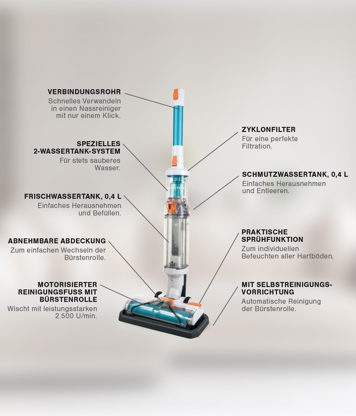 Akkustaubsauger und Nasssauger in einem Gerät - der Invictus X7 inklusive X Water vereint saugen und wischen. Mit einem Klick vom Staubsauger zum Nassreiniger! Jegliche Flüssigkeiten wie beispielsweise verschütteter Ketchup, Farbe, Joghurt, Senf, Milch oder getrockneter Schmutz, wie Fußabdrücke oder auch bei der Grundreinigung – der X Water sorgt immer für perfekte Reinigungsergebnisse. Der motorisierte Reinigungsfuß mit Bürstenrolle wischt und schrubbt mit leistungsstarken 2.500 Umdrehungen/Minute alle Hartböden. Das spezielle 2-Wassertank-System mit separatem Frisch und- und Schmutzwassertank sorgt für stets sauberes Wasser bei der Reinigung, ohne häufiges Auswechseln des Wassertanks. | قیمت یورویی : 494.85€