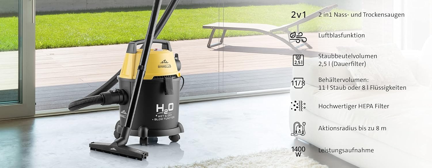 Der Mehrzweckstaubsauger ETA Barello scheut keinen Schmutz - er entfernt Staub und Schmutz, aber auch Flüssigkeiten. Darüber hinaus ist der Wechsel von trockenem zu nassem Saugen schnell und einfach. Ein leistungsstarker Motor mit 1400 W sorgt für eine perfekte Leistung. Die Filterung von Schmutz wird durch einen hochwertigen HEPA-Filter sichergestellt. Die Staubpartikel werden in einem Staubbeutel mit einem Volumen von 2,5 Litern oder direkt in einem großen Abfallbehälter gesammelt, der bis zu 11 Liter fassen kann. Es liegt ganz bei Ihnen, ob Sie mit oder ohne Beutel saugen möchten. Der Barello kann beides. Darüber hinaus können Sie den permanenten Textilstaubbeutel immer wieder verwenden, um nicht nur Geld, sondern auch die Umwelt zu schonen. Nicht nur im Herbst wird sich die Luftblasfunktion als nützlich erweisen, vor der sowohl Schmutz als auch Blätter das Weite suchen werden. | قیمت یورویی : 95.4€