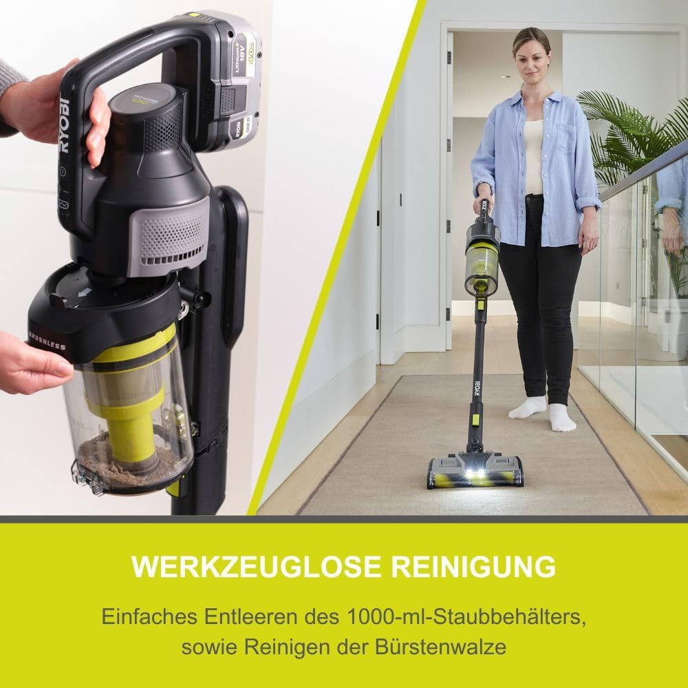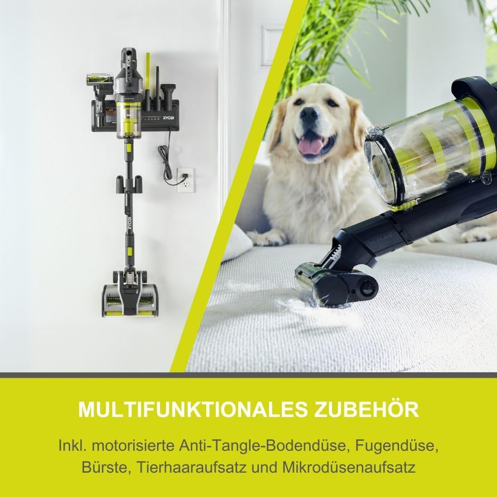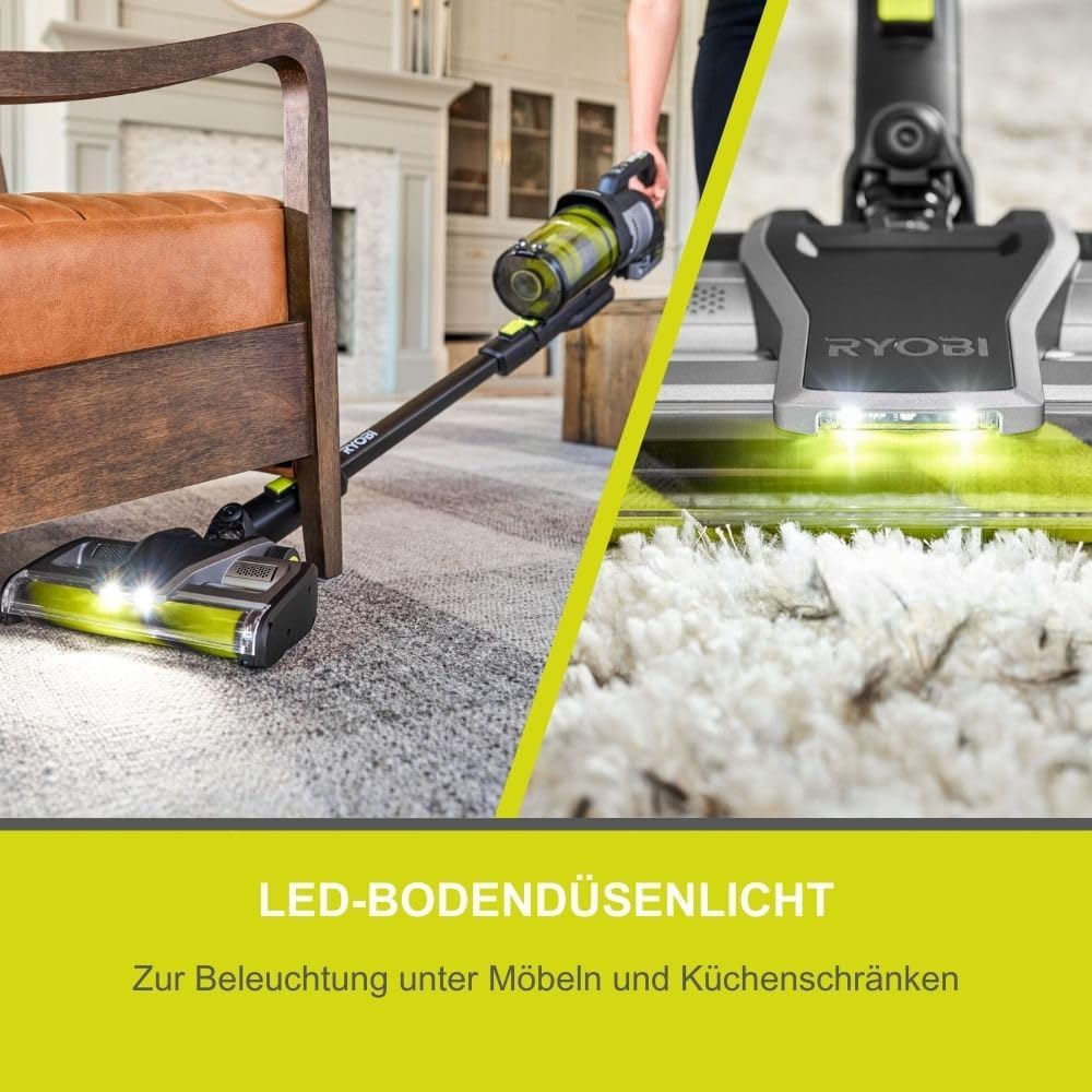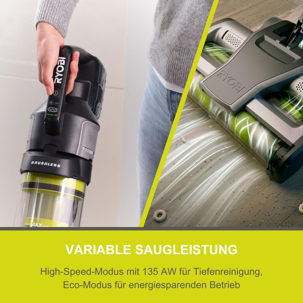 BÜRSTENLOSER MOTOR: Maximale Leistung und längere Laufzeiten dank effizienter Technologie DUAL-ZYKLONEN HEPA 13 FILTER: Fängt feinen Staub und Allergene effektiv ein – ideal für Allergiker ANTI-TANGLE-TECHNOLOGIE: Verhindert, dass Haare sich in der Bürstenwalze verheddern – für wartungsfreien Betrieb VARIABLE SAUGLEISTUNG: High-Speed-Modus mit 135 AW für Tiefenreinigung, Eco-Modus für energiesparenden Betrieb STARKER LUFTSTROM: 1.200 l/min Luftstrom und 135 AirWatt Saugleistung für kraftvolle Reinigungsergebnisse MULTIFUNKTIONALES ZUBEHÖR: Inkl. motorisierte Anti-Tangle-Bodendüse, Fugendüse, Bürste, Tierhaaraufsatz und Mikrodüsenaufsatz ERGONOMISCHES DESIGN: Leicht handhabbar mit einem großzügigen 1.000 ml Staubbehältervolumen 18 V ONE+ AKKUSYSTEM: Kompatibel mit allen Geräten der RYOBI ONE+ Serie – ein Akku für über 200 Werkzeuge, für maximale Flexibilität und Kostenersparnis | قیمت یورویی : 329.99€