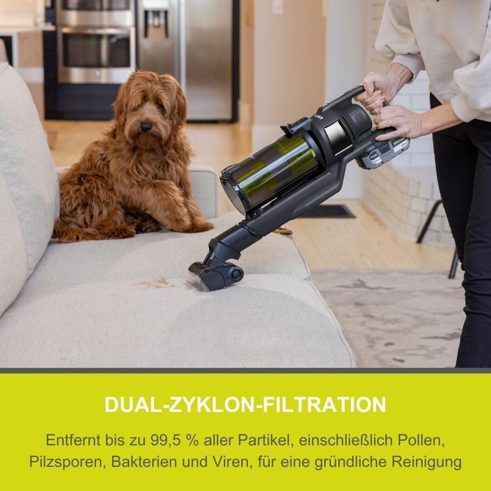 HERAUSRAGENDE LEISTUNG: 90 AirWatt Saugleistung und 900 l/min Luftstrom garantieren kraftvolle Reinigung auf Teppichen, Hartböden und textilen Oberflächen BÜRSTENLOSER MOTOR: Für höhere Effizienz, längere Laufzeiten und eine verbesserte Lebensdauer des Geräts MOTORISIERTE BÜRSTENDÜSE: 26,5 cm breite Bürstenleiste entfernt tiefsitzenden Schmutz aus Teppichen; deaktivierbar für kratzfreies Reinigen von Hartböden GROSSES FASSUNGSVERMÖGEN: 800-ml-Staubbehälter sorgt für längeren Einsatz ohne häufiges Entleeren ERGONOMISCHES DESIGN: Selbststehendes Design und GripZone Anti-Vibrations-Griff für einfache Nutzung und Lagerung 18 V ONE+ AKKUSYSTEM: Kompatibel mit allen Geräten der RYOBI ONE+ Serie – ein Akku für über 200 Werkzeuge, für maximale Flexibilität und Kostenersparnis | قیمت یورویی : 253.09€