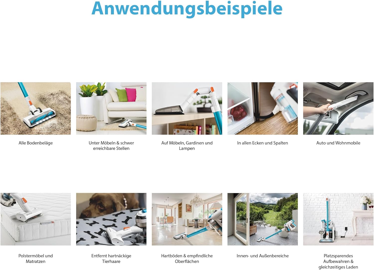 Hochleistungs-BLDC-Motor 380 Watt- Kabellos, beutellos, federleicht und immer griffbereit können im Handumdrehen alle Böden sowie jegliche Innen- und Außenbereiche gründlich gereinigt werden – vom Boden, Teppich bis zur Decke und in allen Zwischenräumen 3-fach Filtersystem inkl. HEPA- Filter- Dank des 3-Fach-Filtersystems inkl. HEPA-Filter werden Allergene und Schadstoffe aus der Luft entfernt. Ideal für Allergiker & die Entfernung von Hausstaubmilben, Allergenen und Verschmutzung durch Tierhaare Gründliche Reinigung bis zu 30 Min.- Der leistungsstarke 25.2 V Akku mit hochwertigen Samsung Lithium-Ionen-Zellen hat eine Laufzeit von bis zu 30 Minuten und reicht für ca. 200 m². Bei Mehrbedarf kann der Akku per Klick gewechselt werden – ohne die Ladezeit abzuwarten 5 LED-Frontlichter- Die Motorisierten Elektrobürste vom Akkusauger entfernt hartnäckigen Schmutz und feinen Staub. Mit 10.000 U/min. dringen die 2-fach speziell entwickelten Borsten der Universal-Bürstenrolle tief in Teppiche ein und sorgen so für die effiziente Tiefenreinigung Praktische Wandhalterung mit Ladestation- Verstauen und gleichzeitiges Laden mit der Wandhalterung + Ladestation. Das Set enthält Akku-Staubsauger aus dem TV, große Elektrobürste mit LED, Fugendüse, 2in1 Kombi-Bürste, Akku-Ladegerät mit Wandhalterung und eine Bedienungsanleitung Den Akku ausschließlich mit dem mitgelieferten Netzadapter aufladen. Keine anderen Geräte mit dem mitgelieferten Netzadapter aufladen. Verwenden Sie ausschließlich Original-Akkus, sonst beeinträchtigen Sie die Sicherheit des Gerätes. Wenn das Gerät längere Zeit nicht genutzt wird, den halb aufgeladenen Akku an einem kühlen, trockenen Ort aufbewahren. | قیمت یورویی : 264.65€