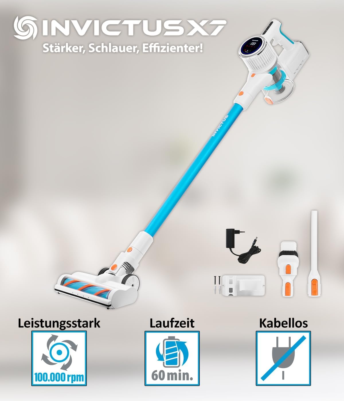 Genius Invictus X7 Facelift Akku Staubsauger kabellos mit HEPA Filter, Akkustaubsauger Handstaubsauger beutellos bis zu 60 Minuten und 380 W, ultra leicht, 12 TLG, Blau/Weiß | قیمت یورویی 235.91€