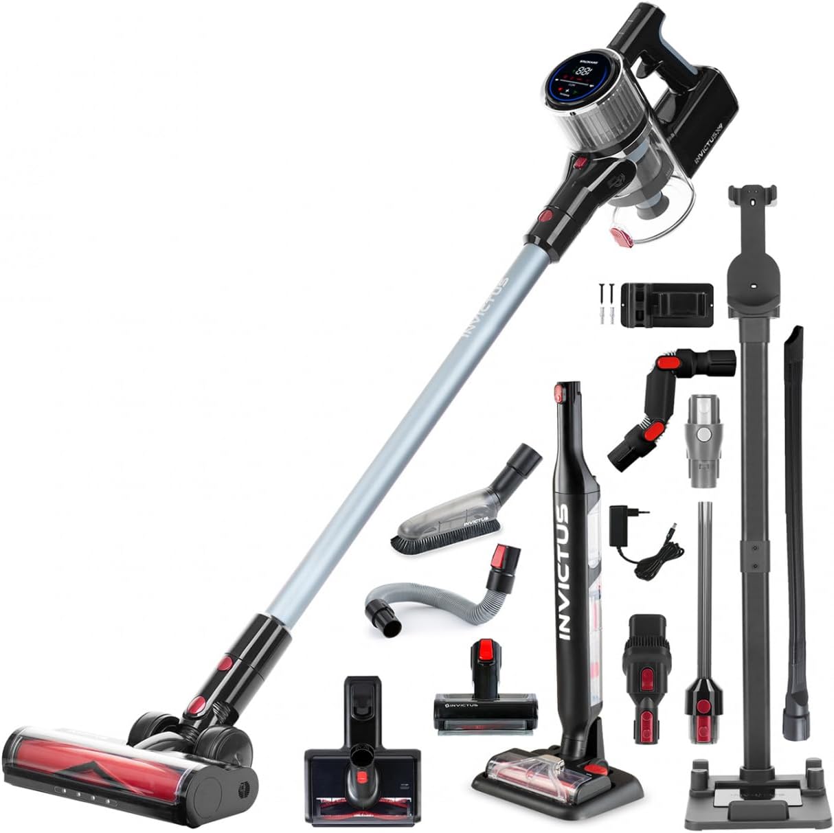 جارو شارژی Genius Invictus X9 Facelift Deluxe 26 تکه، جارو شارژی مرطوب خشک تا 55 دقیقه ماشین موی حیوانات خانگی فرش، فیلتر HEPA، LED، صفحه لمسی جاروبرقی عمودی، ایستگاه شارژ
