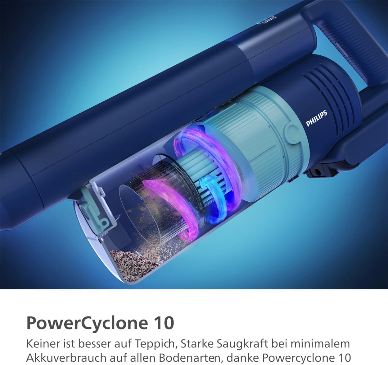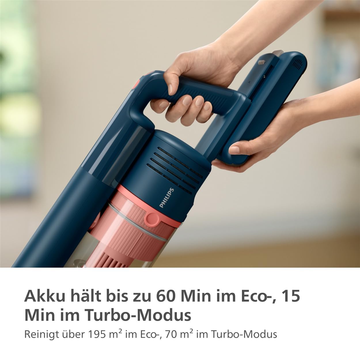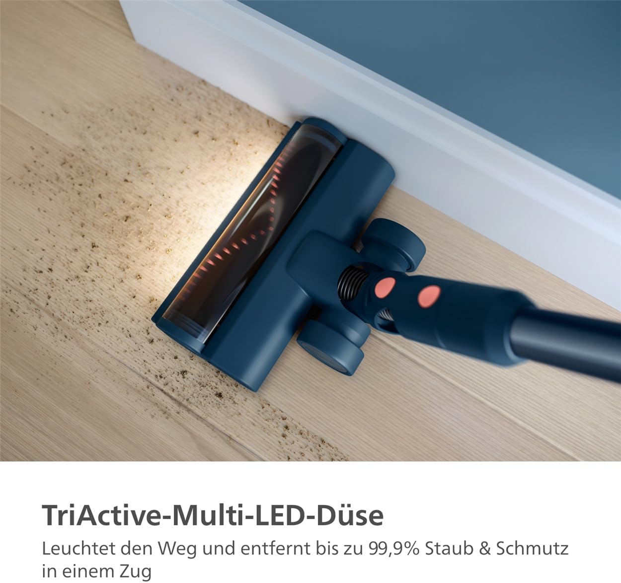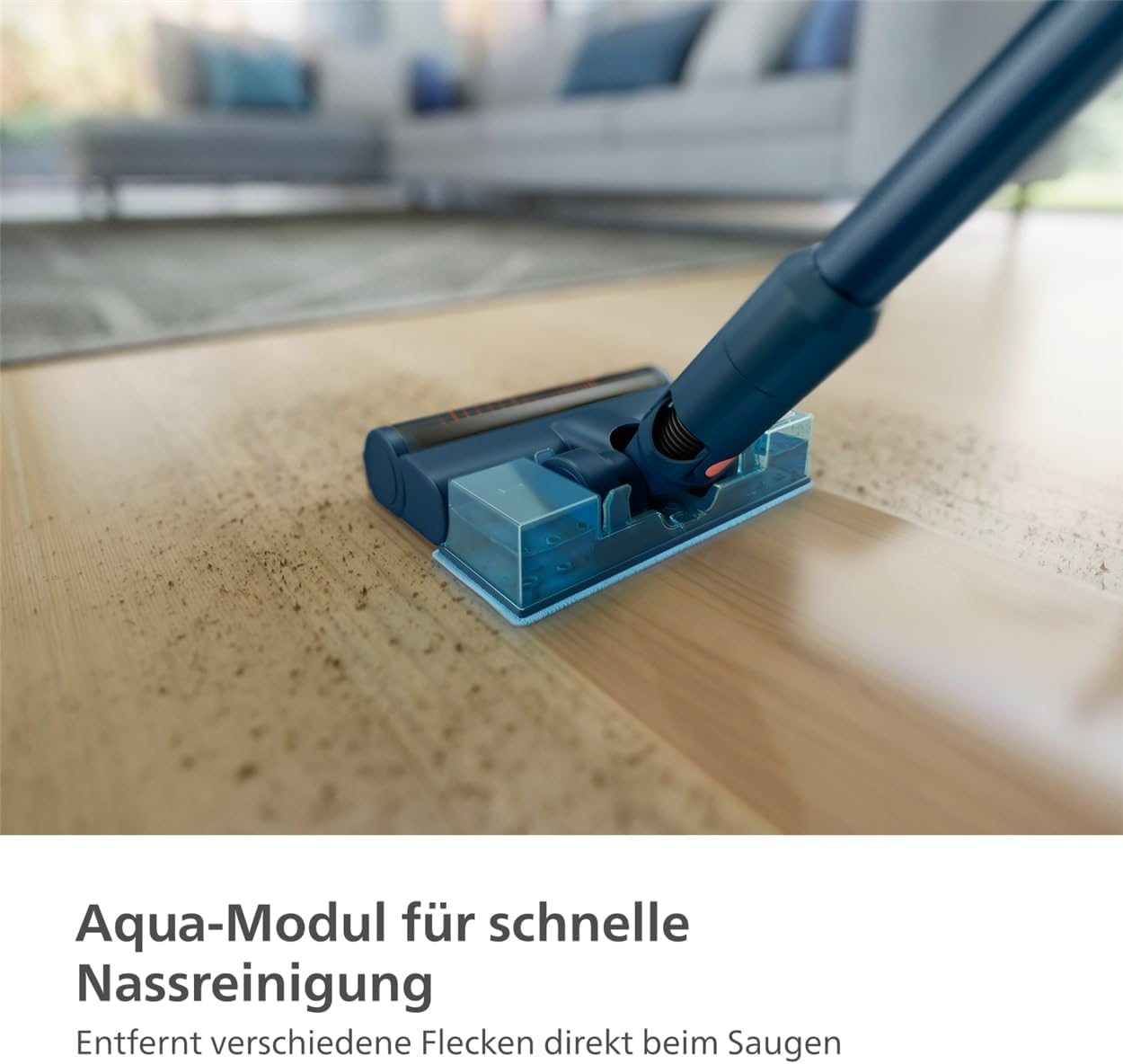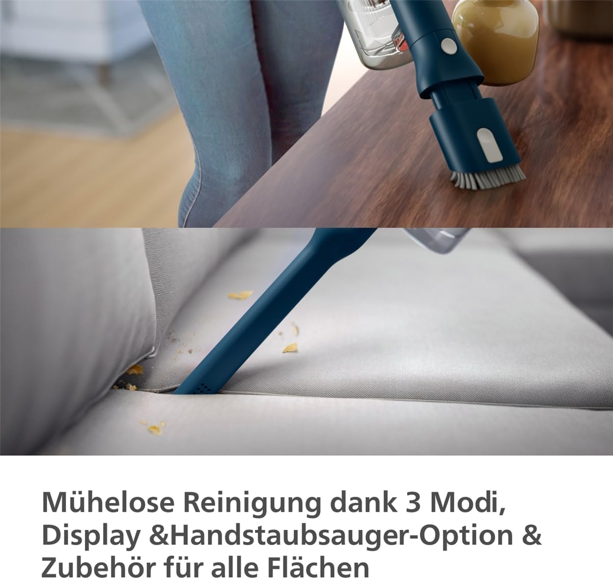 Starke Saugkraft bei minimaler Akkunutzung dank PowerCyclone 10: Erzeugt energieeffizient starken Luftstrom (bis 840 L/min). Entfernt Staub, Schmutz und (Tier-)Haare gründlich - mit längerer Laufzeit. TriActive Multi-LED-Düse mit Lichtstrahl für alle Böden: Entfernt bis zu 99,9% Staub, Schmutz und Haare in einem Zug. Keiner ist besser auf Teppich (1). Reinigt bis zu 3mm nah an Kanten. Einfache Reinigung: 3-Stufen-System, Display & Zubehör. Intuitives Display, Umwandlung in Handgerät. Fugendüse für enge Stellen, 2-in-1-Kombinationsbürste für empfindliche Oberflächen. Austauschbarer Akku: 60 Min. im Eco-, 15 Min. im Turbo-Modus. Reinigt über 195 m² (Eco) oder 70 m² (Turbo). Mehr Laufzeit? Tausche den Akku und sauge sofort weiter! Tierhaar-Düse entfernt mühelos hartnäckige Tierhaare von Sofa & Hundebett. Aqua-Modul für Nassreinigung beseitigt Flecken beim Saugen. Dein kabelloser Staubsauger: effizient, vielseitig, praktisch! | قیمت یورویی : 299.99€