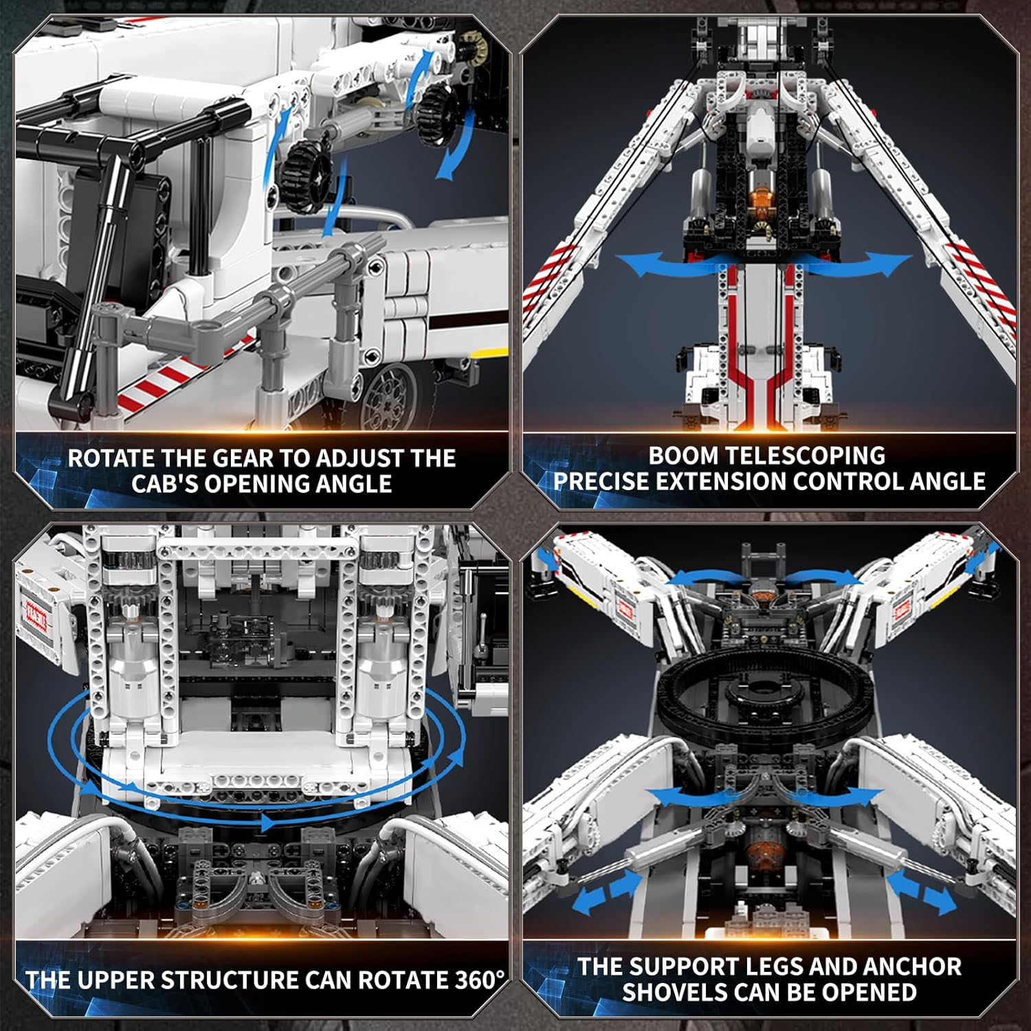 Der größte Kran in der Mould King Technik-Serie kombiniert maximale Hubkraft mit einer langen, ausfahrbaren Auslegerkonstruktion. Ausgestattet mit einem aktiven Hinterachslenksystem, Y-förmigen Seilen und einem flexiblen Gittermast bietet er herausragende Hebeleistung. Der dreistufige Ausleger ist ausziehbar, und die Kombination aus Haupt- und Seitenausleger erreicht eine maximale Höhe von 160 cm, wobei die Hubhöhe präzise gesteuert werden kann. Flaggschiff-Version Mould King 17007 – ausgestattet mit 20 Motoren, 3 Lithiumbatterien, speziellen pneumatischen Komponenten, Kohlefaserteilen und 12 Gewichtsausgleichern. Maße: 12150,732,8 cm. Die volle Ausdehnung des Hauptarms erreicht eine Länge von 160 cm. Mit drehbarem Zahnrad, einstellbarem Kabinenöffnungswinkel und paralleler Verbindung von L-Motor und Servomotor zur Steuerung der pneumatischen Aufblasfunktion per Knopfdruck, wodurch sich die pneumatischen Stützbeine frei ausfahren lassen. Mould King Kran kombiniert ein 9-Achs-Chassis-Design mit einer aktiven Hinterachsabweichungstechnologie, die eine flexible Lenkung der Hinterräder ermöglicht und den minimalen Wendekreis erheblich verkleinert. Die obere Struktur kann um 360° gedreht werden, die Stützbeine können geöffnet werden, und das Y-förmige Seilsystem ermöglicht eine präzise Steuerung des Auslegers und seiner Neigung. Dieses Spielzeugset enthält viele Bausteine, alle Komponenten sind sortiert und sorgfältig verpackt, damit nichts verloren geht. Eine Montageanleitung ist enthalten, sodass Sie schrittweise beginnen können. Kompatibel mit den meisten ähnlichen Bausteinen auf dem Markt und mit hoher Erweiterbarkeit. Das beste Heimlernspiel für alle. Das Spielen mit den Kindern wird eine wunderbare Eltern-Kind-Zeit sein. Dieses Set ist ein hervorragendes Spielzeuggeschenk für Jungen und Mädchen zu Valentinstag, Geburtstag oder Vatertag, besonders geeignet für Kinder, Jugendliche und Erwachsene ab 8, 9, 10, 12, 14 Jahren und älter. Es ist konsistent, kompatibel, leicht zu verbinden und löst sich nicht leicht. Mit all den gewünschten Funktionen zu einem erschwinglichen Preis ist es die beste Spielzeugwahl für Geburtstag, Kindertag, Weihnachten oder Ostern. Jedes unserer Produkte wird vor der Verpackung automatisch ausgewählt und durch drei Tests geprüft. Wenn Teile in Ihrem Set fehlen, kontaktieren Sie uns bitte. Vielen Dank. | قیمت یورویی : 539€