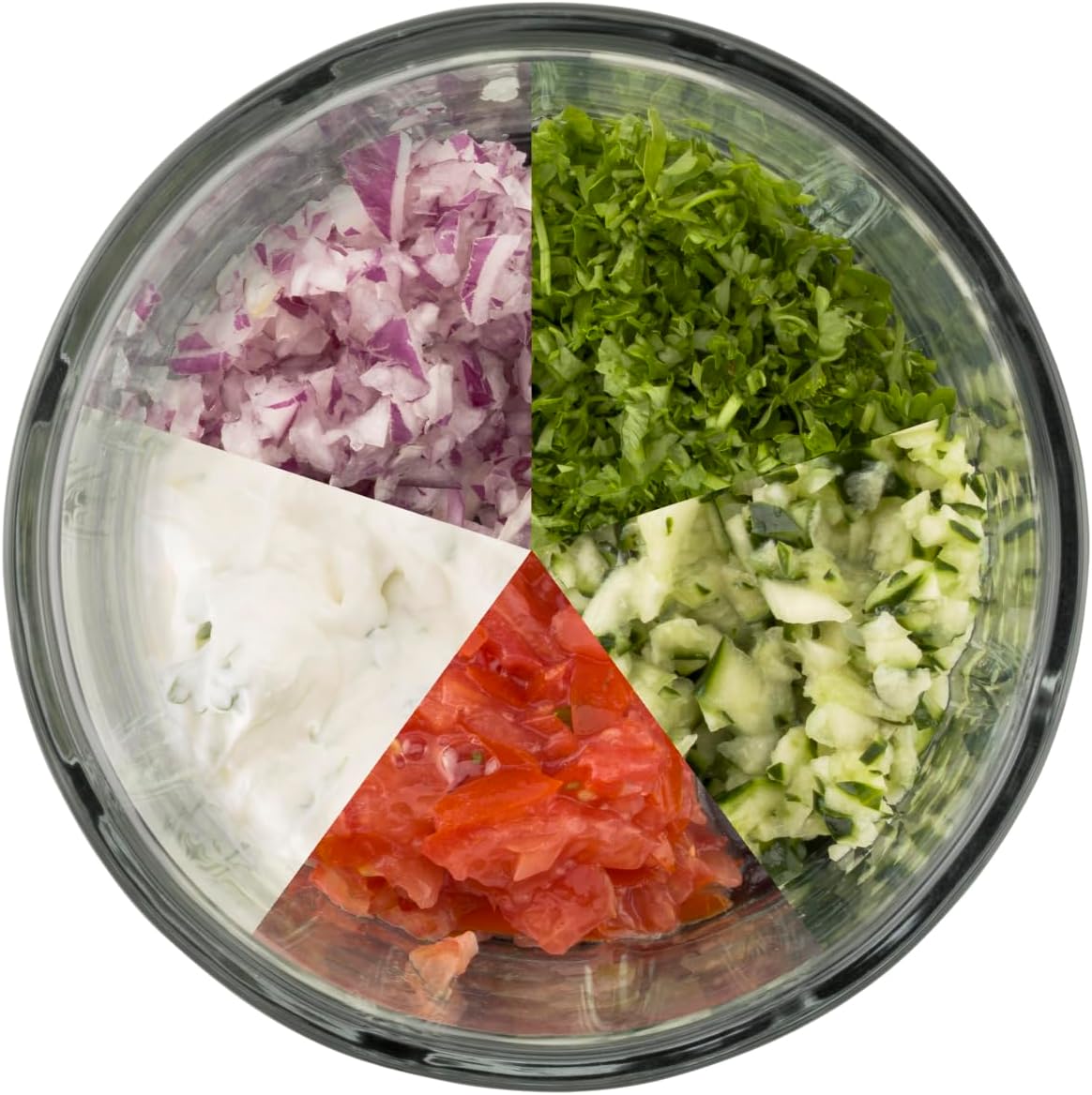 Inhalt: 1x Zerkleiner mit Frischhaltedeckel (Höhe 14 cm, Ø 12 cm, Füllmenge 900 ml) inkl. 2-flügelige Edelstahlklinge - Artikelnummer: 1876786040 Material: Mixbehälter (spülmaschinengeeignet), Deckel aus hochwertigem Kunststoff. Klingen aus Edelstahl. Für Deckel und Rotor wird Handwäsche empfohlen Der Allesschneider hat ein Bajonett-Verschluss zum sicheren Verschließen des rutschfesten Behälters während der Verarbeitung von Gemüse, Zwiebeln, Nüssen, Kräuter oder Obst Die zwei scharfen Edelstahl-Klingen arbeiten rotierend auf zwei Höhen und sorgen in Sekunden für ein zuverlässiges Ergebnis. Durch den Deckel ist ebenfalls ein Aufbewahren und Frischhalten möglich Der Multischneider mixt, püriert, hackt, schneidet, zerkleinert und kann als Gemüseschneider, Zwiebelschneider, Knoblauchhacker, Multihacker, Chopper oder Garlic Crusher verwendet werden | قیمت یورویی : 26.57€