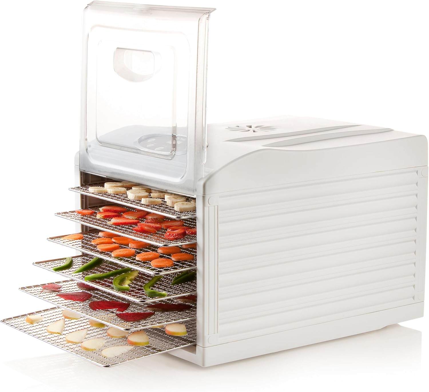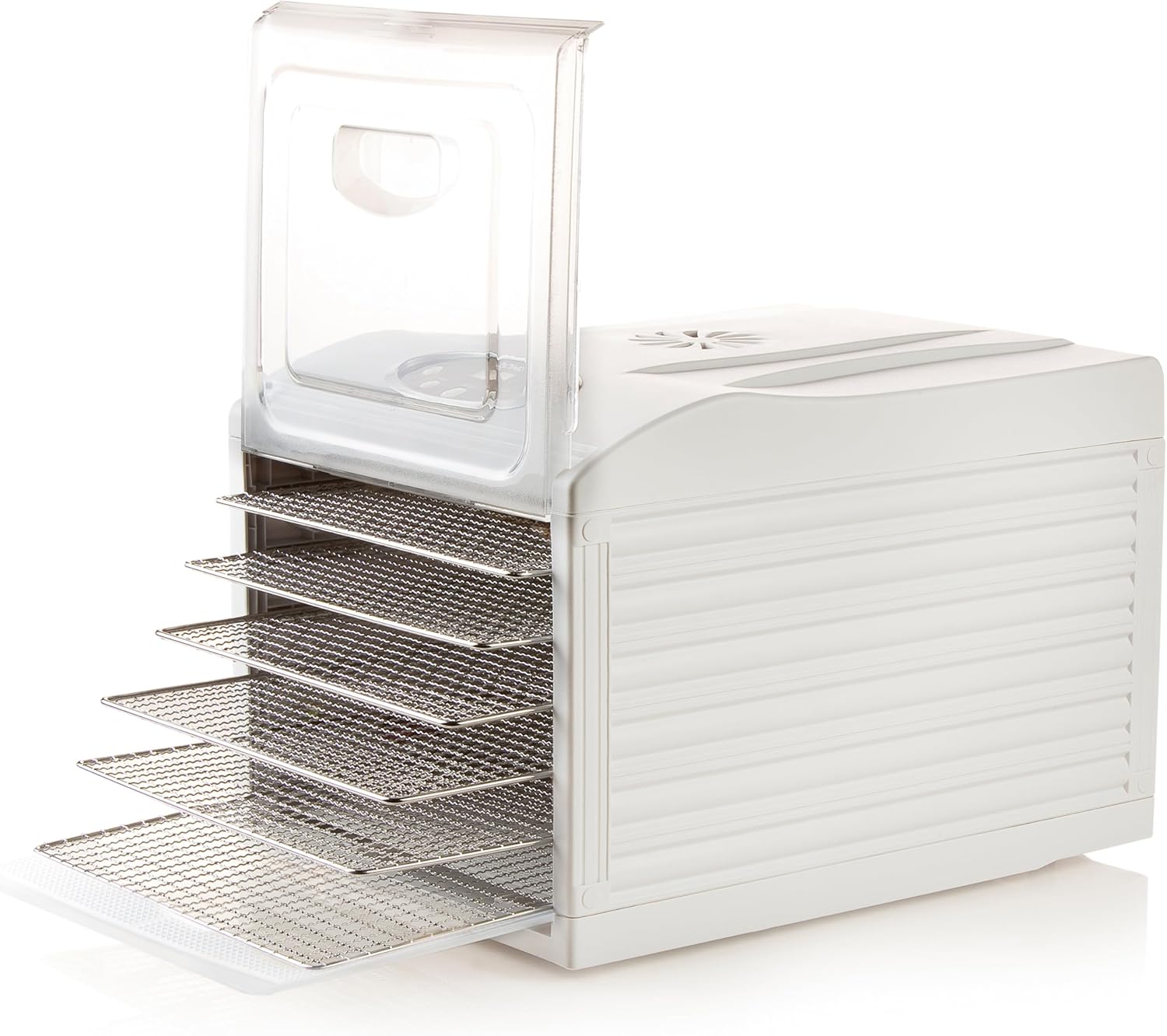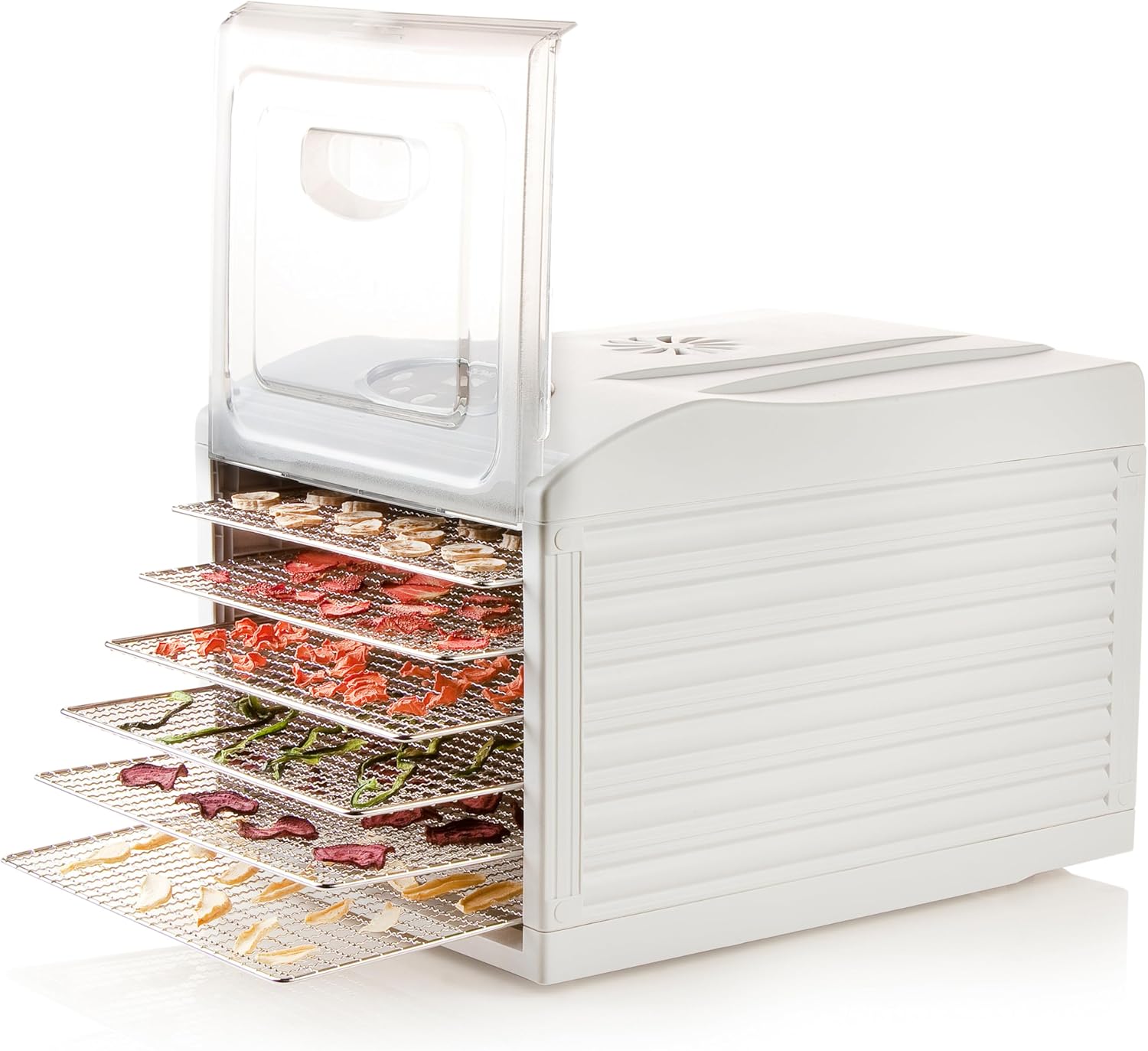 Präsentieren Sie Ihre Gerichte mit getrockneten Nahrungsmitteln wie die Profis. Bereiten Sie Delikatessen, wie zum Beispiel Gemüsechips, getrocknete Früchte, sonnengetrocknete Tomaten, Kräuter, getrocknetes Fleisch oder Fisch Geben Sie Ihren Gerichten einen besonderen und köstlichen Touch Verlängert die Haltbarkeit von Nahrungsmitteln, unter Beihaltung der meisten Vitamine, Mineralien und anderen Nährstoffe 6 Trocknungseinstellungen in rostfreiem Edelstahl Timer: 30 min - 19,5 Stunden Regulierbare Temperatur: 35°C-70°C Einfach zu reinigen 230 V - 50 Hz -420 - 500 W | قیمت یورویی : 169.79€