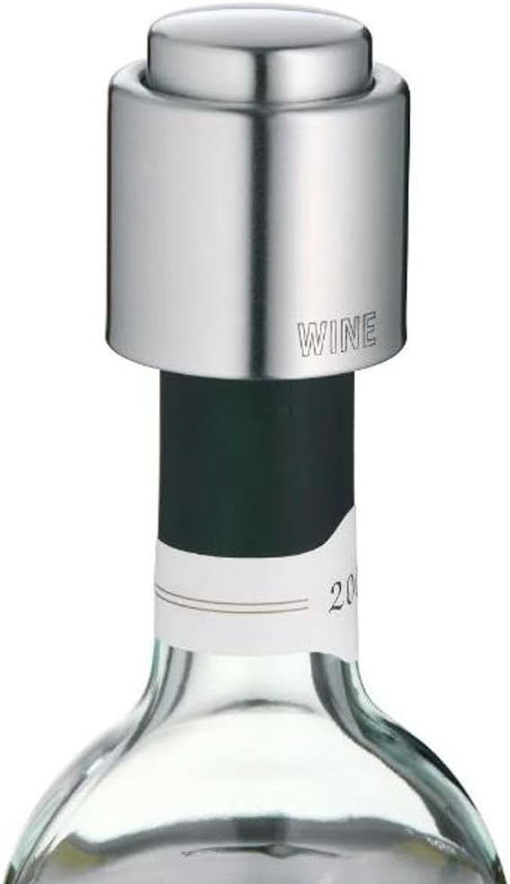 Inhalt: 1x Weinflaschenverschluss mit Schriftzug "Wine" (Höhe 4,7 cm, Ø 2,4 cm) - Artikelnummer: 0641026030 Material: Cromargan Edelstahl 18/10, mattiert - passend für viele Weinflaschen Der Weinflaschenverschluss verschließt durch einfaches Aufsetzen luftdicht. Durch leichten Druck auf den oberen Knopf wieder leicht zu öffnen Angebrochene Wein-Flaschen bleiben tagelang frisch und können auslaufsicher (auch liegend) im Kühlschrank aufbewahrt werden Der Verschluss kann einfach mit einer Hand geöffnet bzw. geschlossen werden indem auf den Knopf des Verschlusses gedrückt wird und passt in jede Besteckschublade | قیمت یورویی : 8.99€