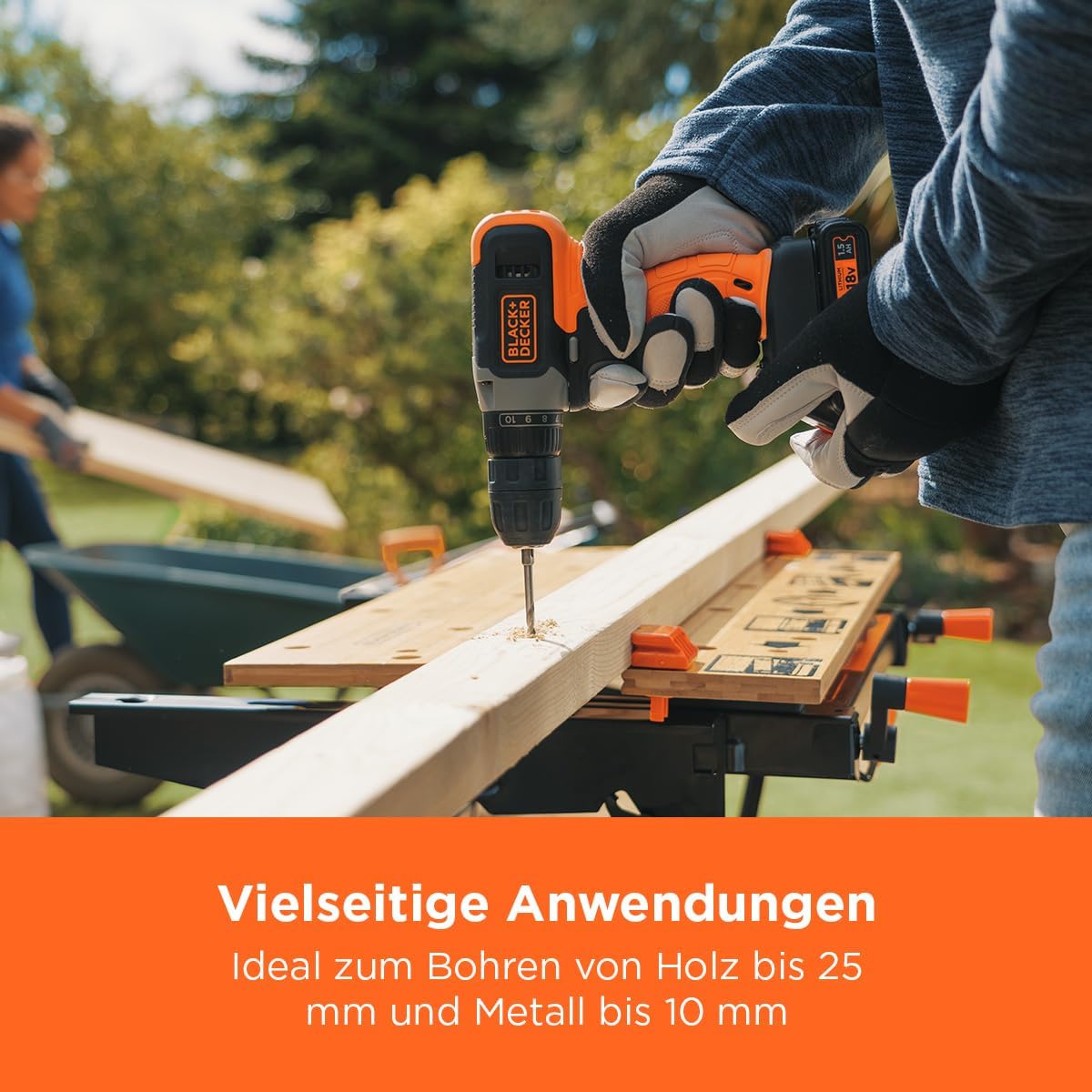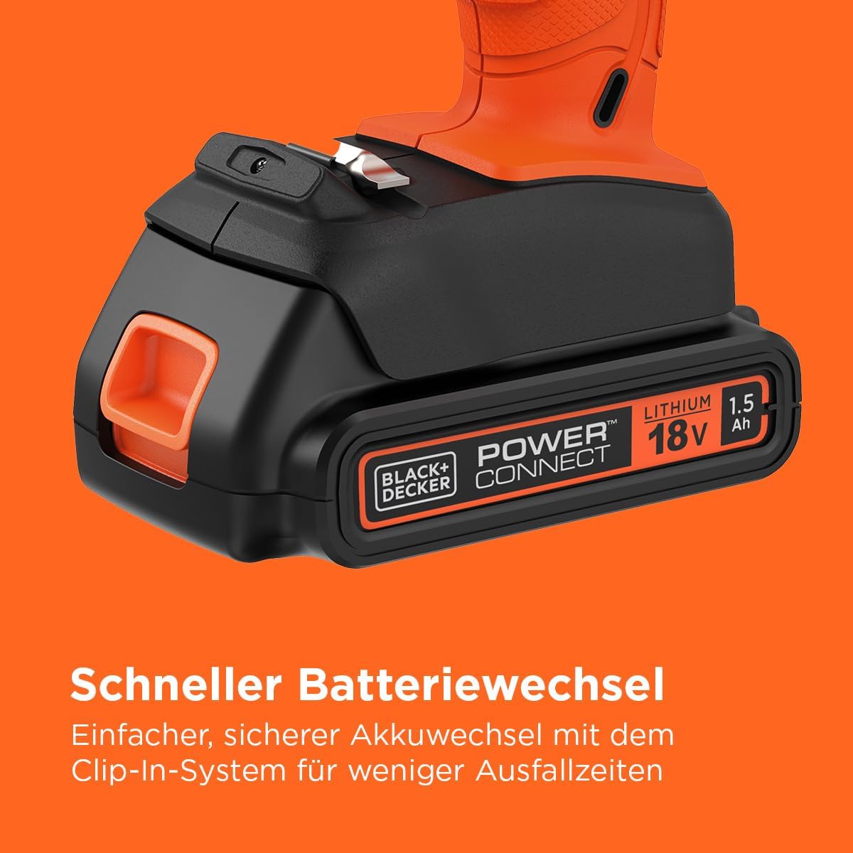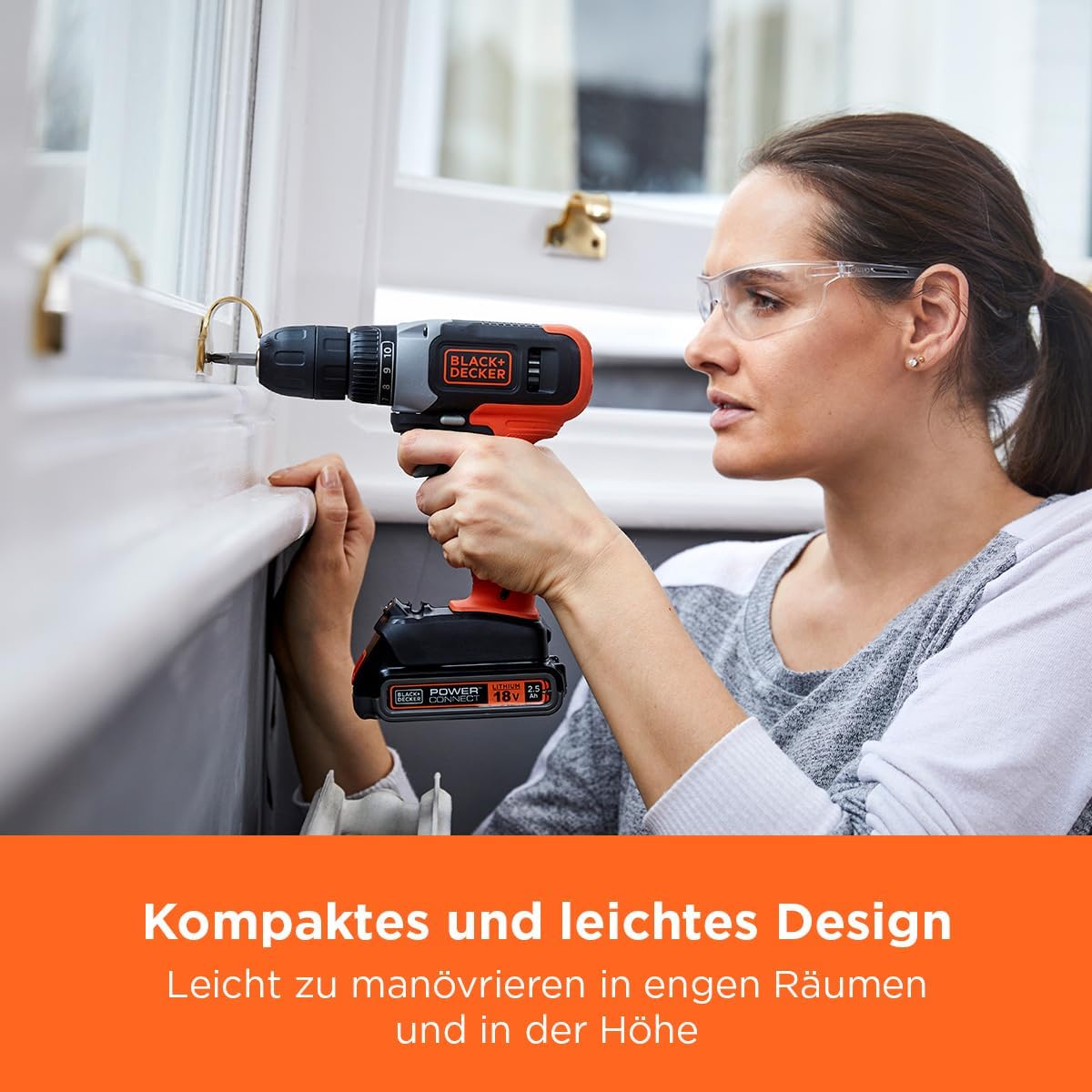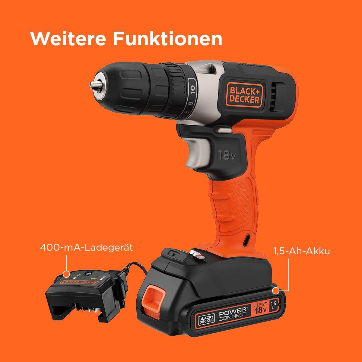 PRÄZISIONSKONTROLLE: 10 Kupplungspositionen für genaues Bohren und Schrauben in Holz, Metall und Kunststoff. VARIABLE GESCHWINDIGKEIT: Der Schalter mit variabler Geschwindigkeit ermöglicht eine Feinsteuerung für eine Vielzahl von Anwendungen. SCHNURLOSE FREIHEIT: Teil der 18V POWERCONNECT-Serie, kompatibel mit allen BLACK+DECKER 18V-Produkten. KOMFORTABLE VERWENDUNG: Antirutsch-Weichgriff für erhöhten Komfort bei längerem Gebrauch. PRAKTISCHE LED-ARBEITSLEUCHTE: Die integrierte LED-Arbeitsleuchte beleuchtet Ihren Arbeitsbereich für eine bessere Sichtbarkeit. SCHNELLER BATTERIEWECHSEL: Einfaches und sicheres Batterie-Clip-in-System für schnellen und einfachen Batteriewechsel. LEISTUNGSSTARKE LEISTUNG: 37 Nm Drehmoment für effiziente Bohr- und Schraubarbeiten. BOHRLEISTUNG: Bohrt mit Leichtigkeit durch Holz bis zu 25 mm und Metall bis zu 10 mm. KOMPAKT UND LEICHT: Entwickelt für einfache Handhabung, auch auf engstem Raum oder bei Arbeiten in der Höhe. ENTHÄLT: (1) 1,5-Ah-Akku, (1) 400-mA-Ladegerät für unterbrechungsfreie Leistung. | قیمت یورویی : 64.25€