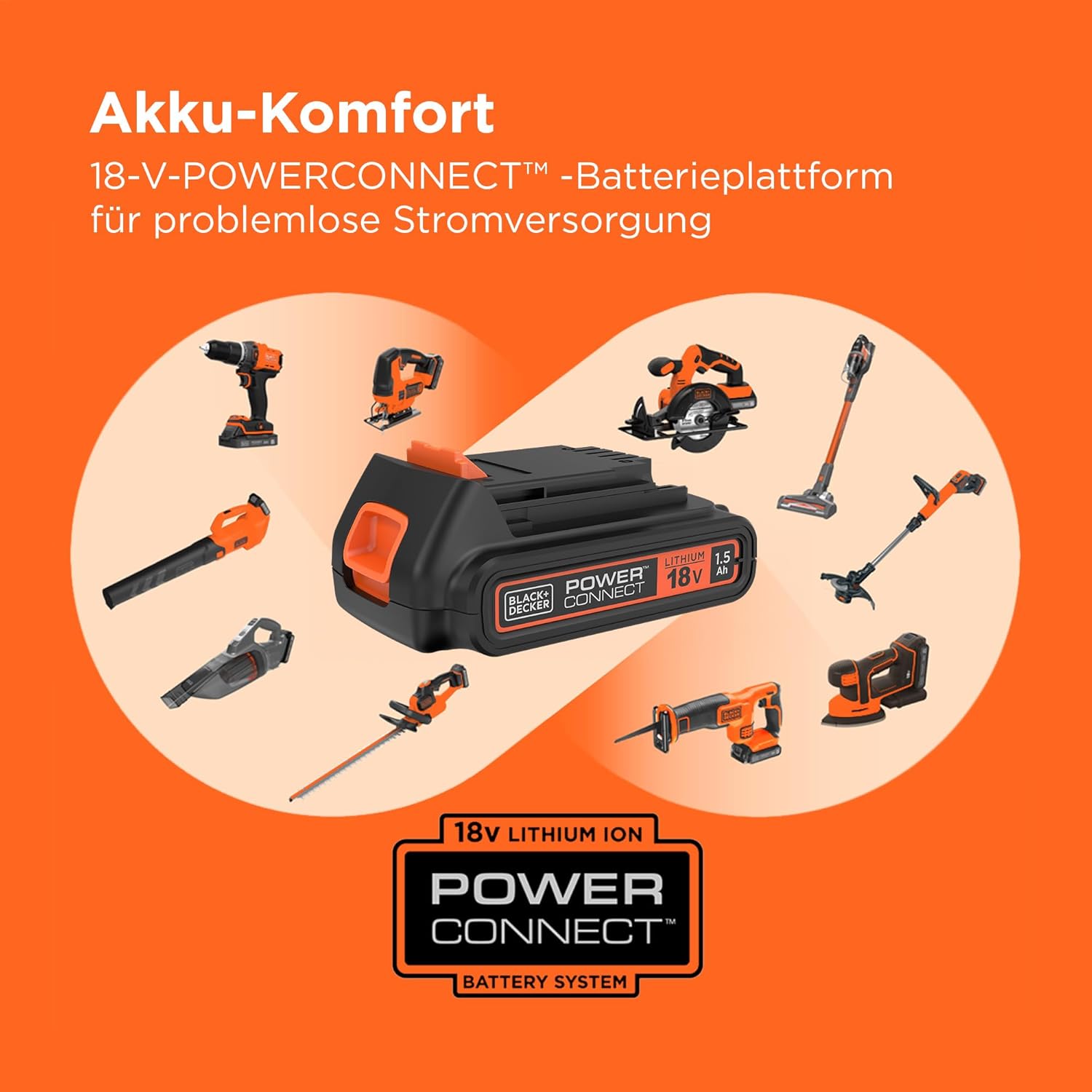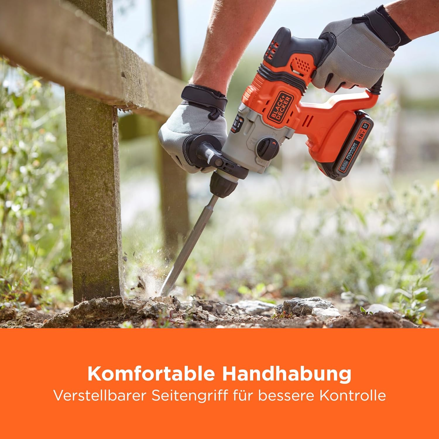 SCHNURLOSER KOMFORT: Teil des 18-V-POWERCONNECT -Batteriesystems, das langanhaltende Leistung ohne Kabelaufwand bietet. DREI BOHRMODI: WECHSELN Sie schnell zwischen Bohren, Meißeln oder Chippen für den vielseitigen Einsatz bei verschiedenen Aufgaben. LEISTUNGSSTARKE LEISTUNG: Bietet 1,2 J Schlagenergie für effizientes Bohren und Hämmern in zähen Materialien. VERSTELLBARER GRIFF: Mit einem verstellbaren und abnehmbaren Seitengriff für bessere Kontrolle und Komfort während des Gebrauchs. HELLES LED-LICHT: Integriertes LED-Licht beleuchtet den Arbeitsbereich und sorgt für Präzision bei schlechten Lichtverhältnissen. LITHIUM-IONEN-TECHNOLOGIE: Langlebiger Akku, der die Ladung bei Nichtgebrauch bis zu 18 Monate hält. VIELSEITIGE AKKUPLATTFORM: Kompatibel mit allen BLACK+DECKER 18V POWERCONNECT Werkzeugen für zusätzlichen Komfort. EINFACHER FUTTERADAPTER: Mit dem MITGELIEFERTEN Futteradapter können Sie ganz einfach zwischen SDS-Plus- und Standard-Bohrern wechseln. IDEAL FÜR MEHRERE ANWENDUNGEN: Perfekt für Mauerwerk, Holz, Stahl und leichte Meißelarbeiten. LIEFERUMFANG: 18-V-SDS-Plus Akku-Bohrhammer, 4,0-Ah-Akku, 2-A-Ladegerät, Kit-Box, Bohrfutteradapter und Beton-Bit. | قیمت یورویی : 184.37€