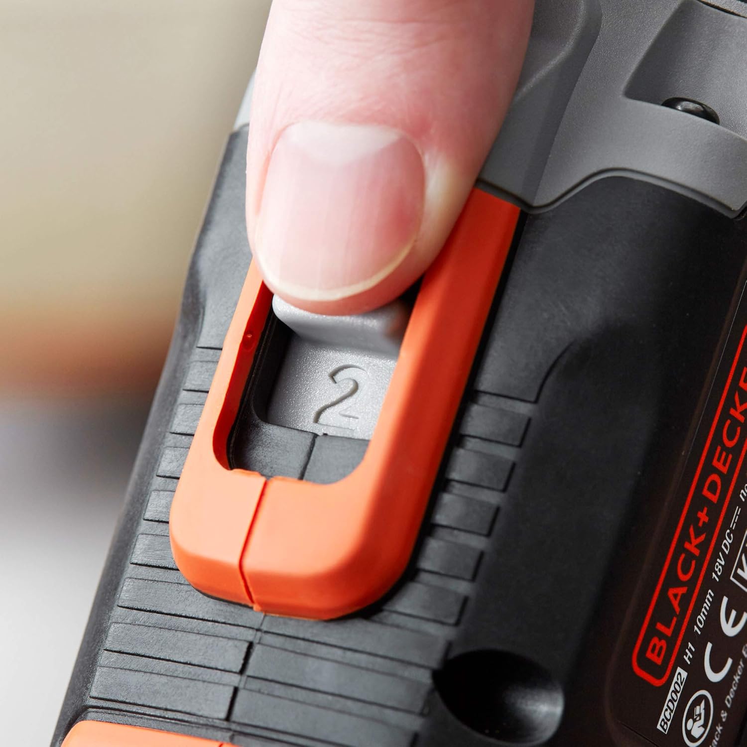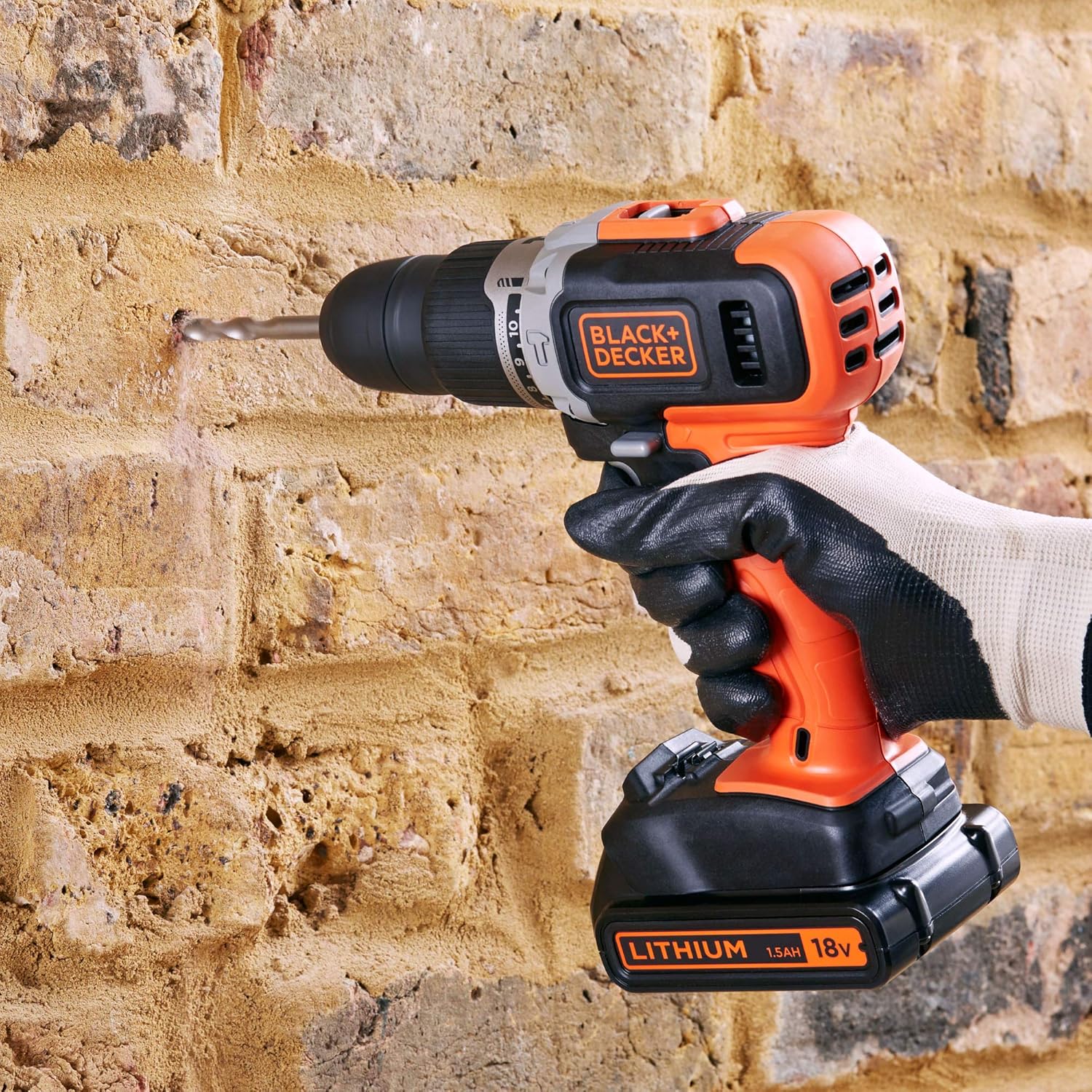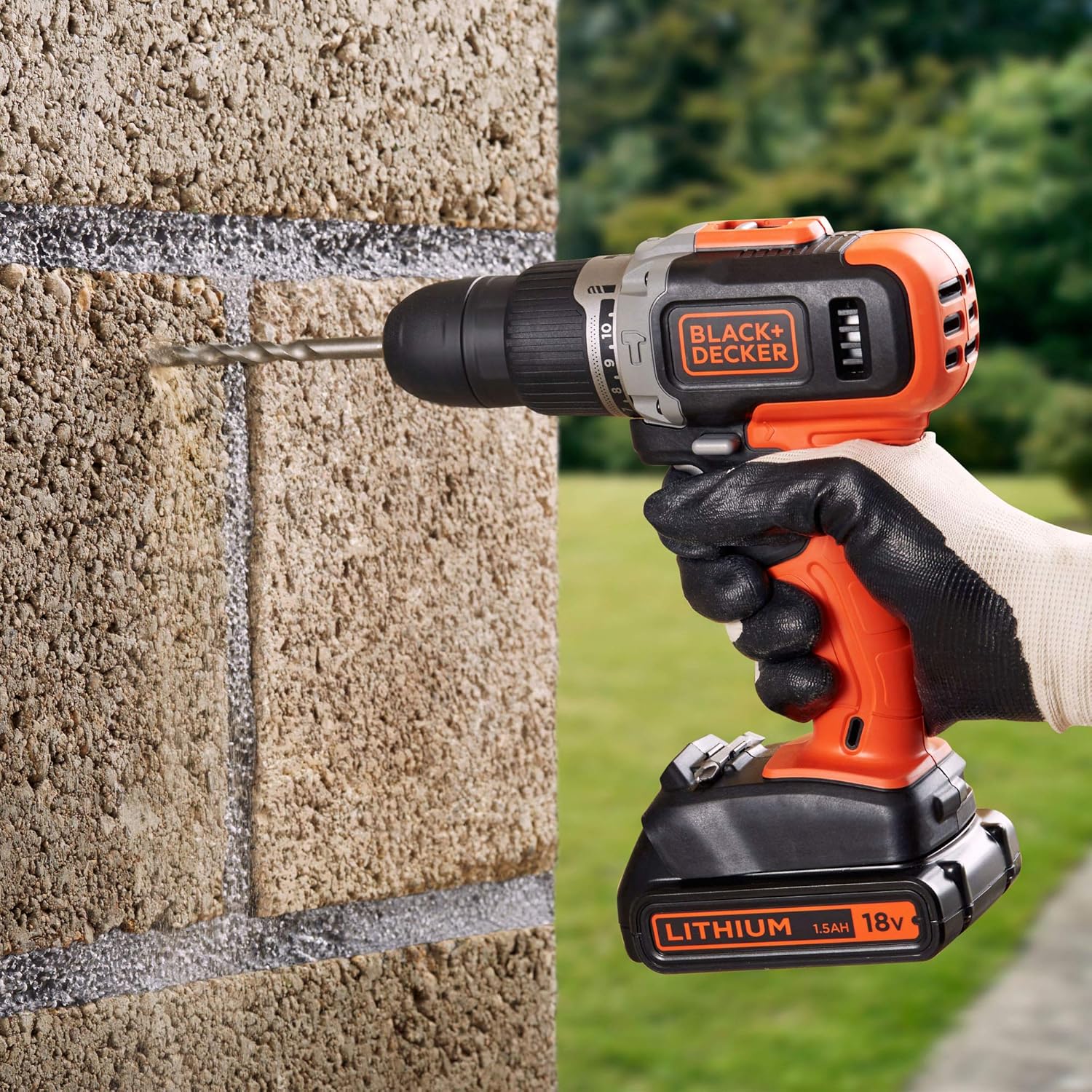EFFIZIENTES BOHREN: Hohe Geschwindigkeit zum Bohren in Holz und Stahl, niedrige Geschwindigkeit für präzises Schrauben. LEISTUNGSSTARKES MAUERWERKSBOHREN: Hammer Action bekämpft hartes Mauerwerk und Beton für Arbeiten wie die Wandmontage. PRÄZISE STEUERUNG: 11 Kupplungspositionen für präzises Bohren. KOMPATIBLES SYSTEM: Funktioniert mit allen BLACK+DECKER 18V Akku-Produkten der POWERCONNECT Serie. LANGLEBIGE LEISTUNG: Lithium-Ionen-Akku hält die Ladung für 90 Tage, immer bereit, wenn Sie es sind. KOMFORTABLE ANWENDUNG: Antirutsch-Weichgriff für weniger Ermüdung bei Heimwerkerprojekten. VERBESSERTE SICHTBARKEIT: LED-Arbeitsleuchte hellt dunkle Bereiche für einfachere Aufgaben wie hängende Regale auf. EINFACHER BATTERIEWECHSEL: Sicherer, schneller Batteriewechsel für kontinuierliche Arbeiten an Projekten wie Flatpack-Möbeln. IDEAL ZUM BOHREN: Löcher für Wanddübel, Zusammenbauen von Bücherregalen, Aufhängen von Vorhangschienen, Installieren von Leuchten und Befestigen von Zäunen. LIEFERUMFANG: (2) 1,5-Ah-Akkus, (1) 400-mA-Ladegerät. | قیمت یورویی : 109€