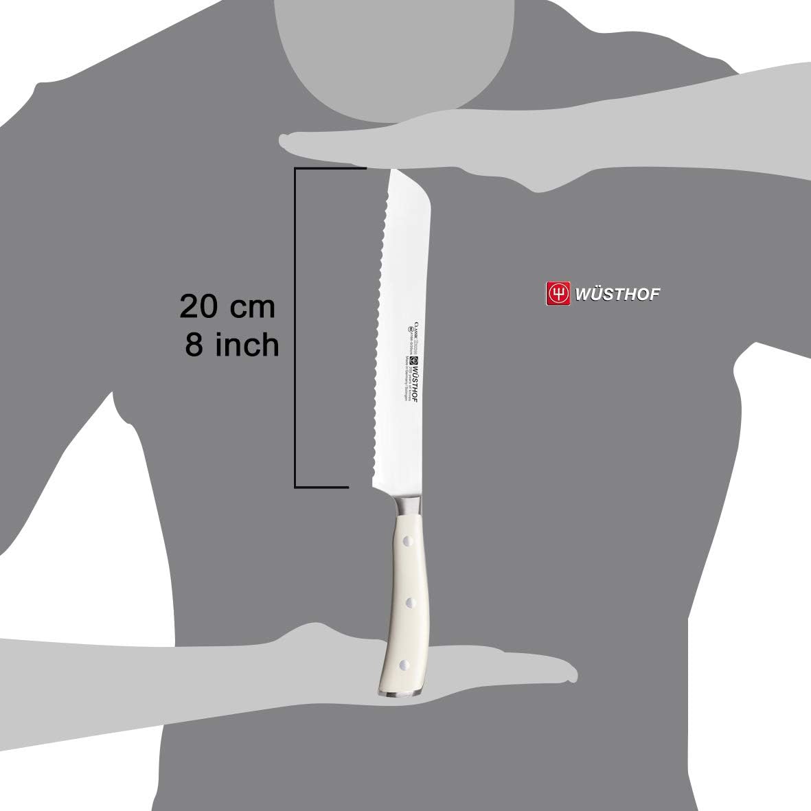 Mit den cremeweißen Griffen sind Wüsthof Messer der Classic Ikon Crème Serie ein eleganter Eyecatcher in der Küche. Dabei sorgt die anspruchsvolle Solinger Qualität bei der Anwendung für einen weiteren Wow-Effekt – richtig gute Kochmesser, zeitloses Design Das Brotschneidemesser mit der scharfen Spezialwelle gehört in jedes Messerset. Neben Brot, Braten und hartschaligen Früchten können Sie das Küchenmesser mit Welle (Brotmesser 20 cm) auch mühelos als Brötchenmesser, Kuchenmesser oder Sägemesser verwenden Die Wellen der Messerklinge greifen sofort und hinterlassen saubere Schnitte – auch bei festen Lebensmitteln. Das ideal ausbalancierte Wellenschliffmesser aus Edelstahl erhält per Hand den finalen Polierabzug – und somit seine langanhaltende Schärfe Durch die kleine Wölbung im vorderen Bereich liegt der ergonomische Griff besonders angenehm und sicher in der Hand. Die hellen, pflegeleichten Griffschalen sorgen für einwandfreie Hygiene und sehen nicht nur in weißen Küchen sehr gut aus Wüsthof Classic Ikon Crème ist das Lieblingsmesser der stilbewussten Köchin, das brillant gute Messer beeindruckt zugleich als offizielles Werkzeug der deutschen Nationalmannschaft der Köche. Qualitätsmesser – Made in Germany, geschmiedet in Solingen | قیمت یورویی : 106.54€