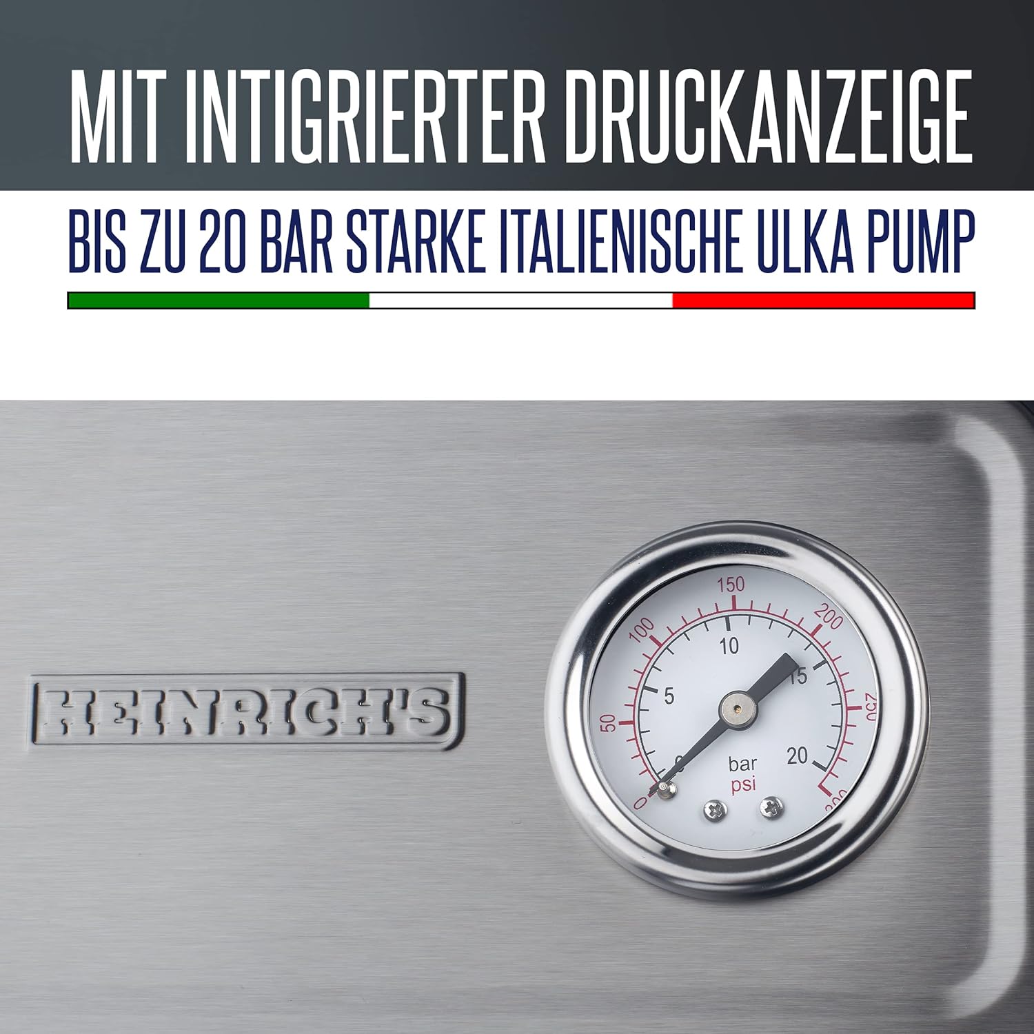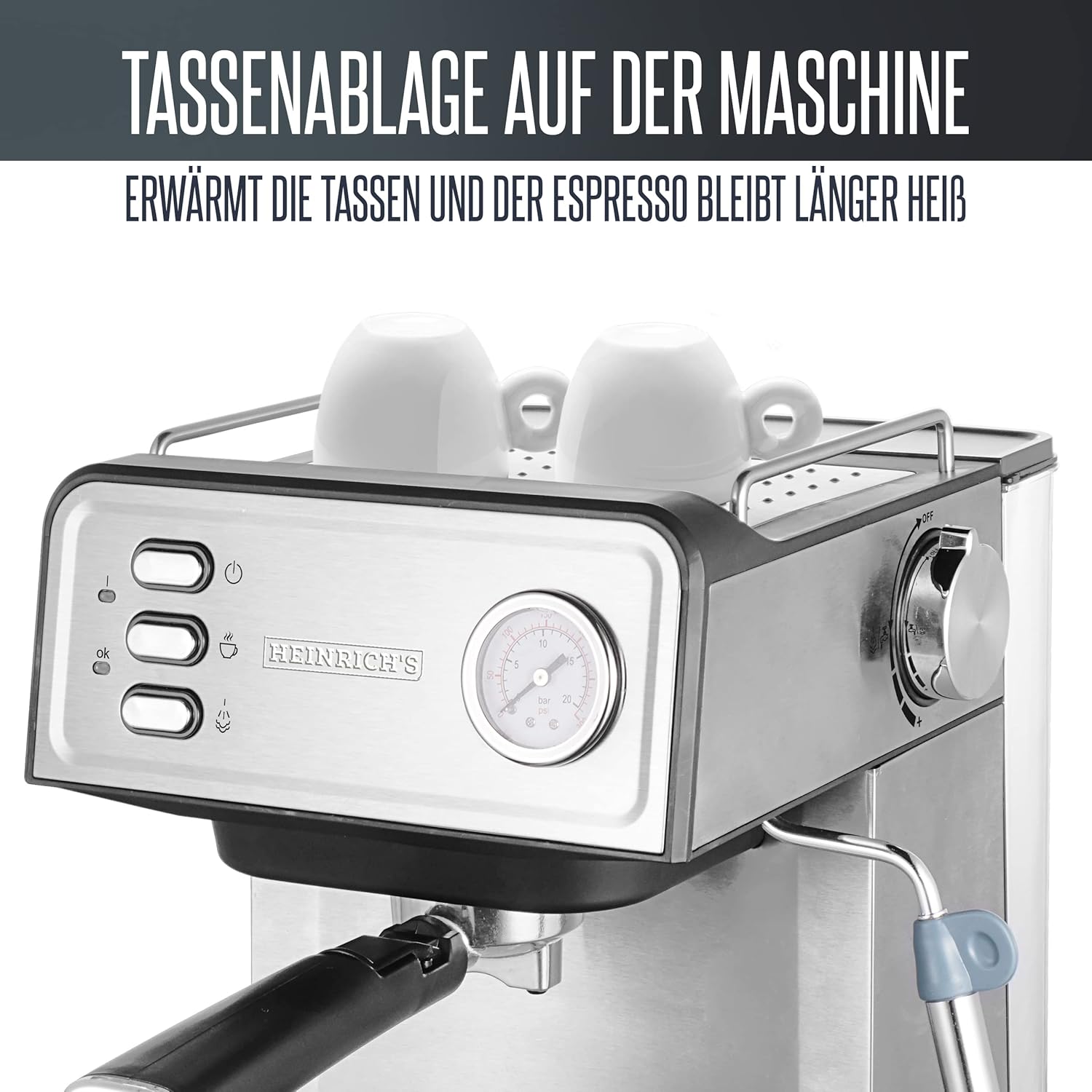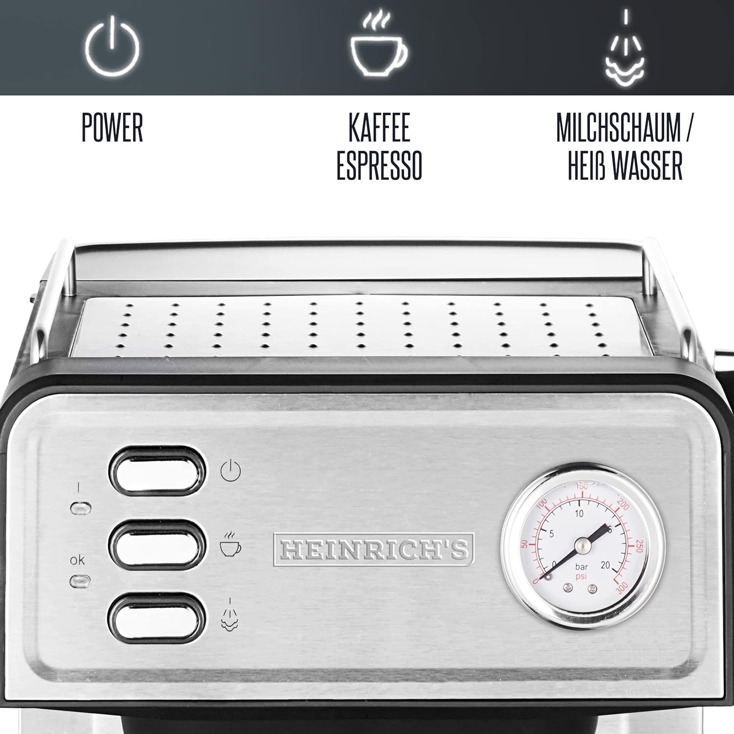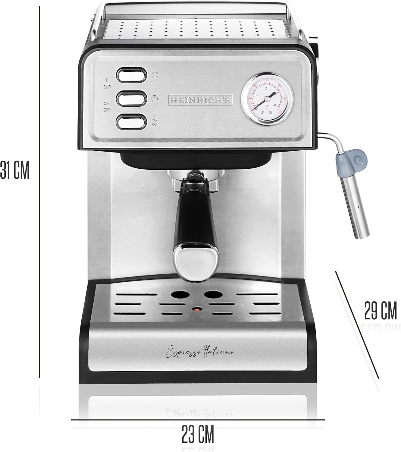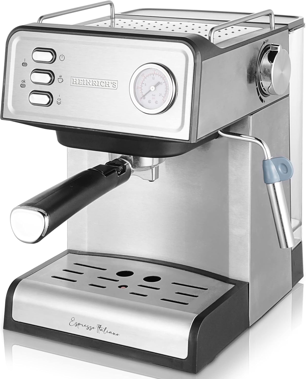 HEINRICHS Espressomaschine, Barista Siebträgermaschine mit 850W, 20 Bar Druck, Kaffeemaschine mit Milchaufschäumer, Doppelauslauf, abnehmbares Tropfgitter, 1.6 L Wassertank, Warmhalteplatte (Button) | قیمت یورویی 89.99€